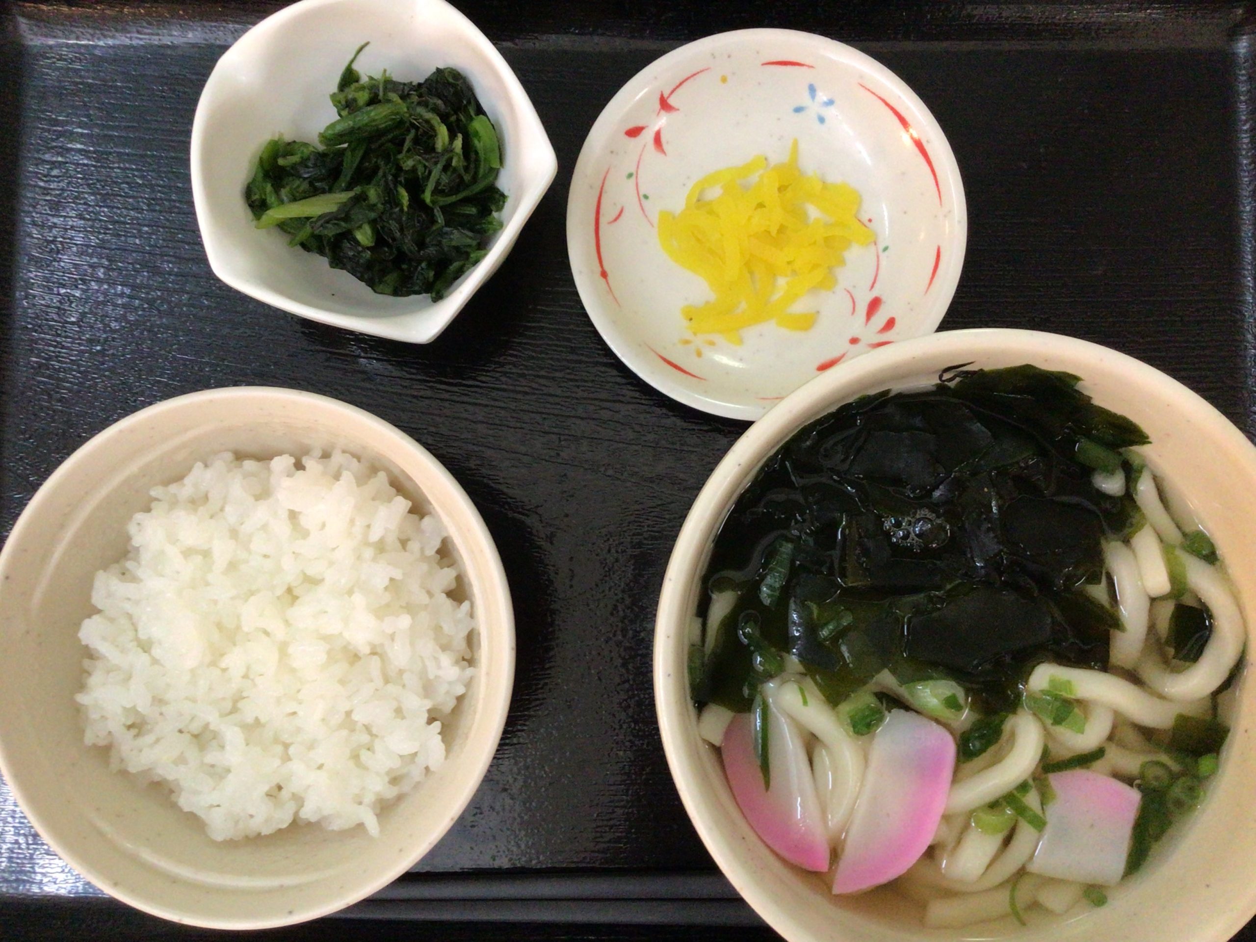 【昼食】 1.米飯 2.わかめうどん 3.ほうれん草お浸し 4.漬物