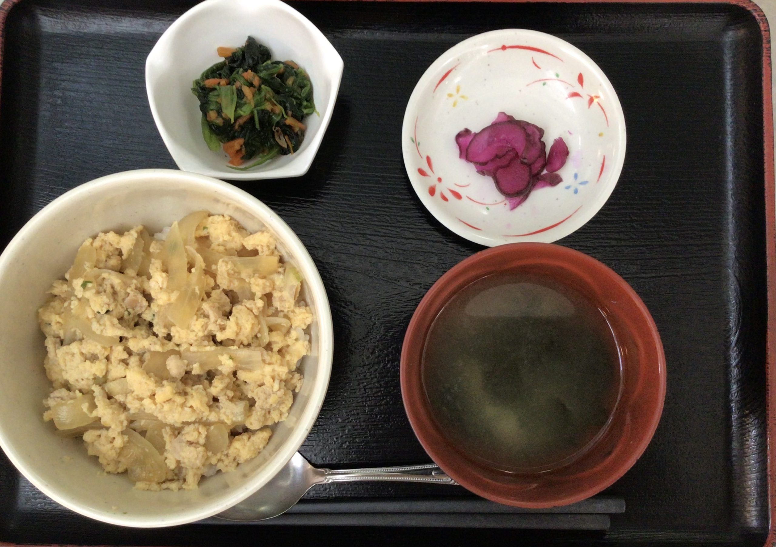 【昼食】 1.親子丼 2.ほうれん草おかか和え 3.漬物 4.みそ汁