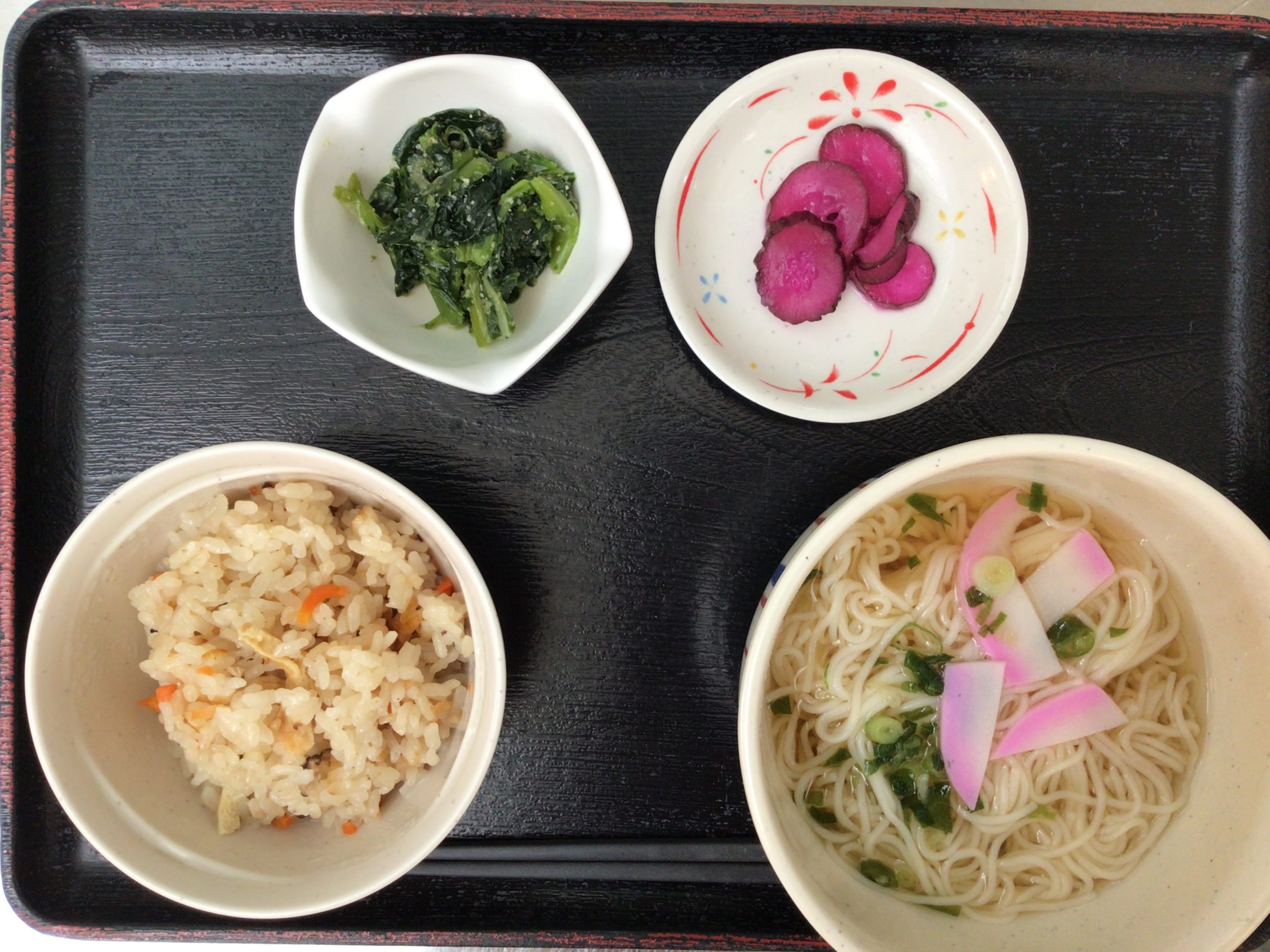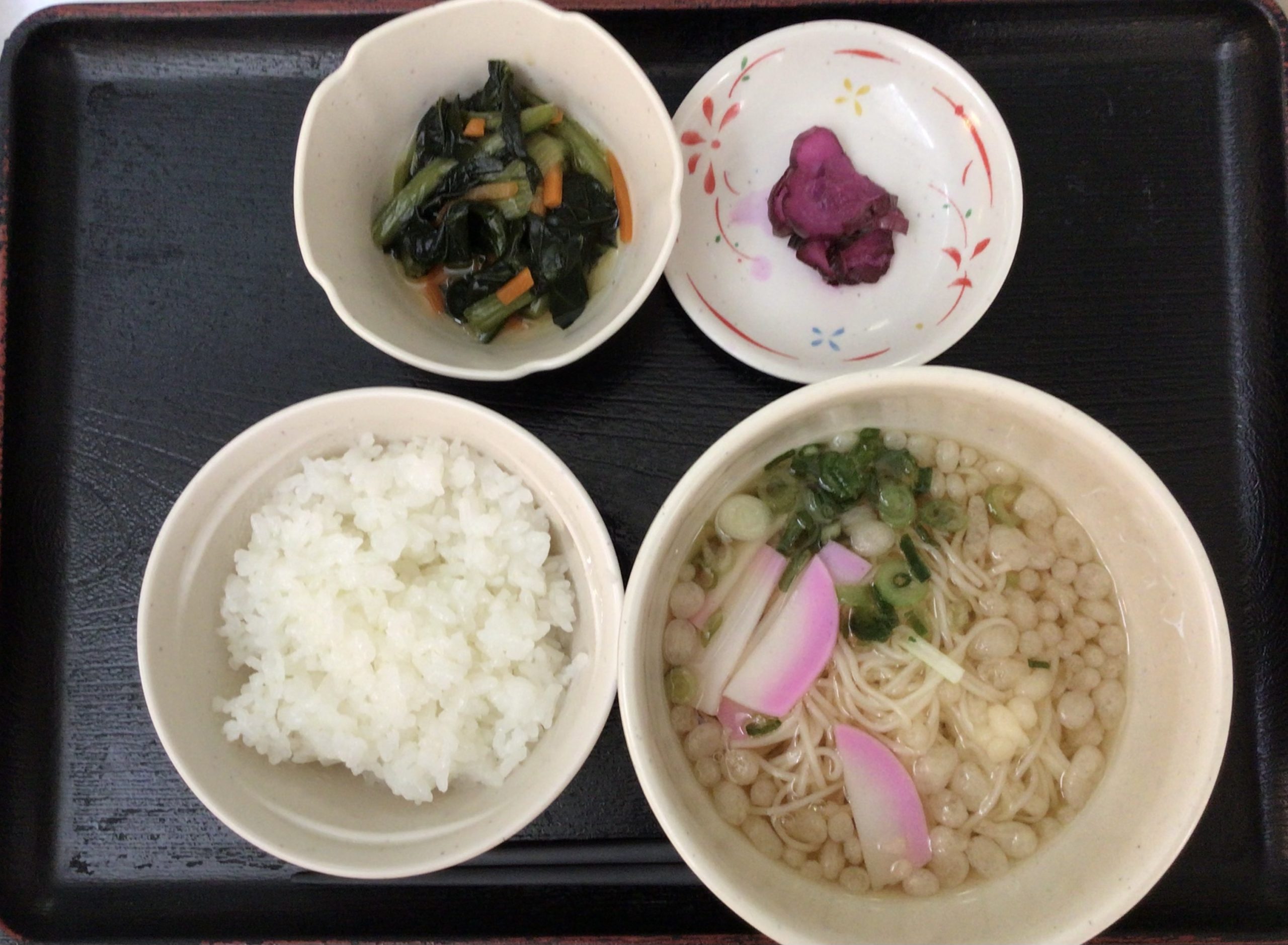 【昼食】 1.米飯 2.にゅうめん 3.小松菜煮浸し 4.漬物
