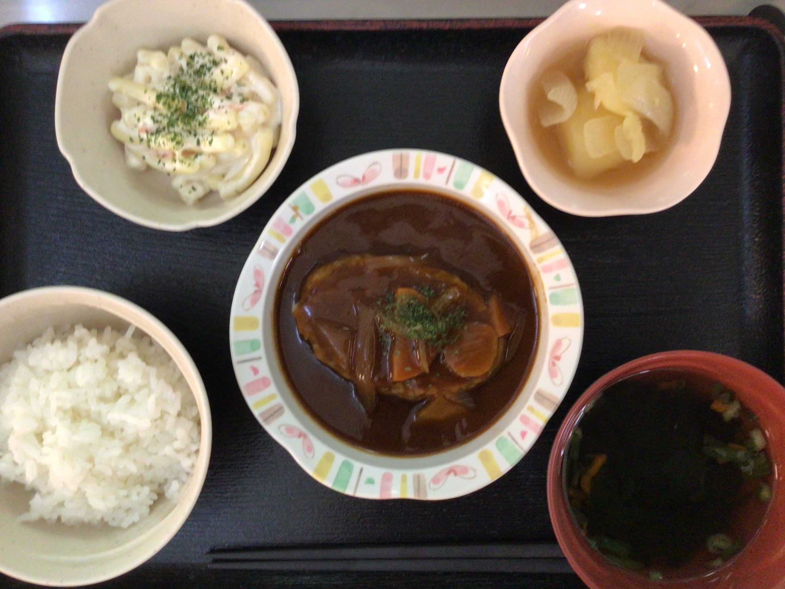 【昼食】 1.米飯 2.煮込みハンバーグ 3.マカロニサラダ 4.じゃがいもソテー 5.すまし汁
