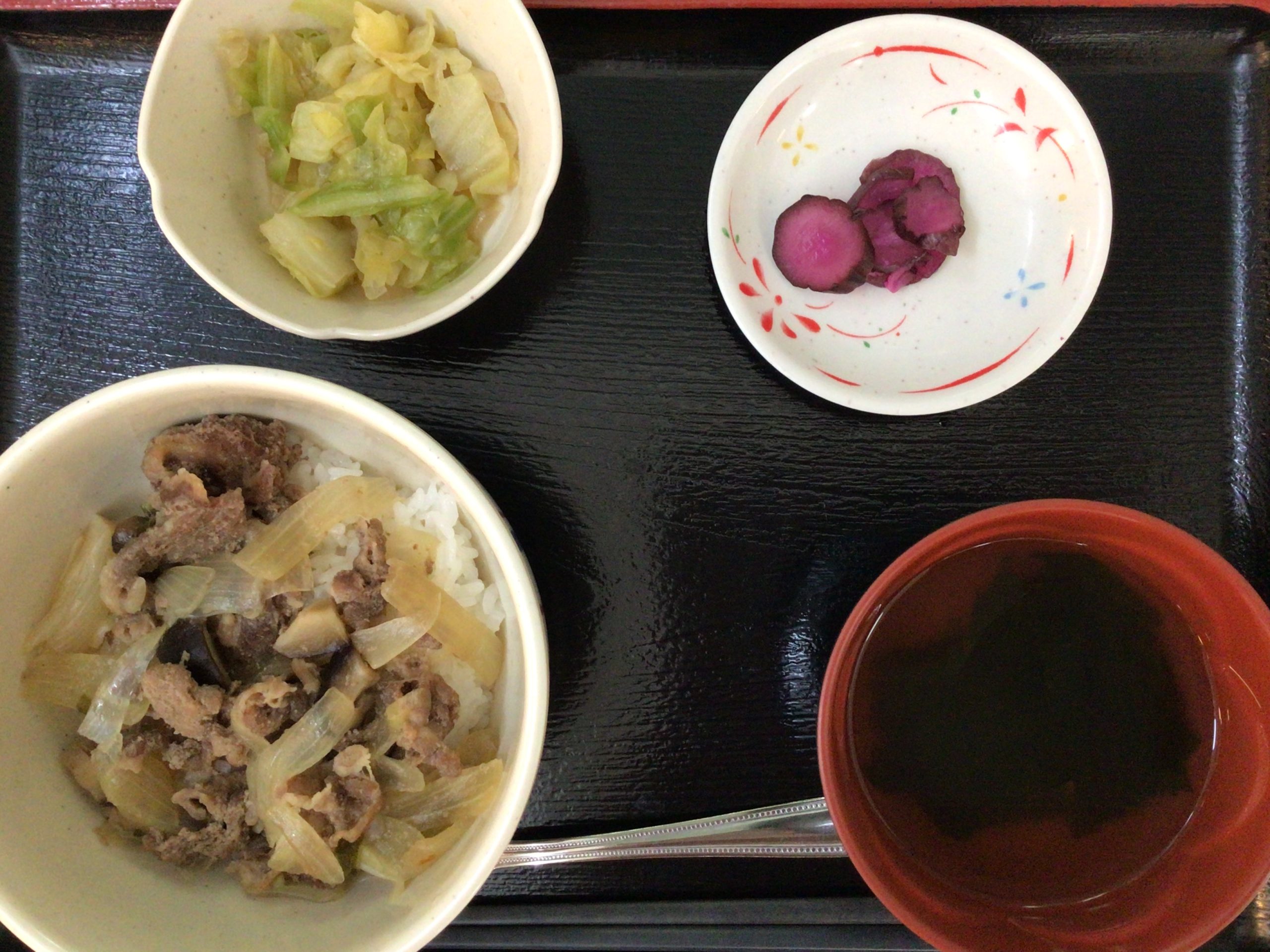 【昼食】 1.豚丼 2.キャベツソテー 3.漬物 4.すまし汁