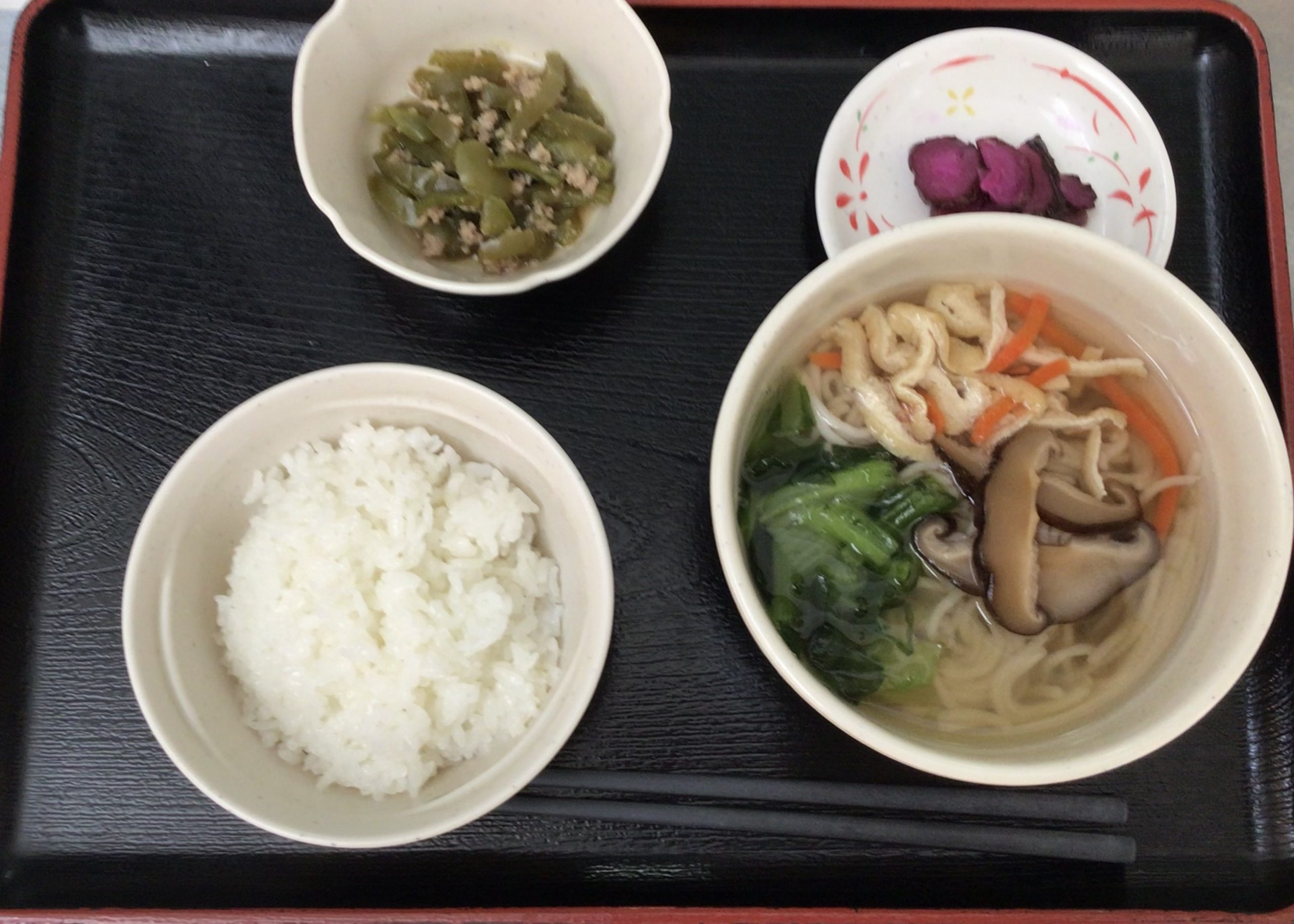 【昼食】 1.ご飯(小) 2.田舎そば 3.ピーマン甘辛炒め 4.漬物