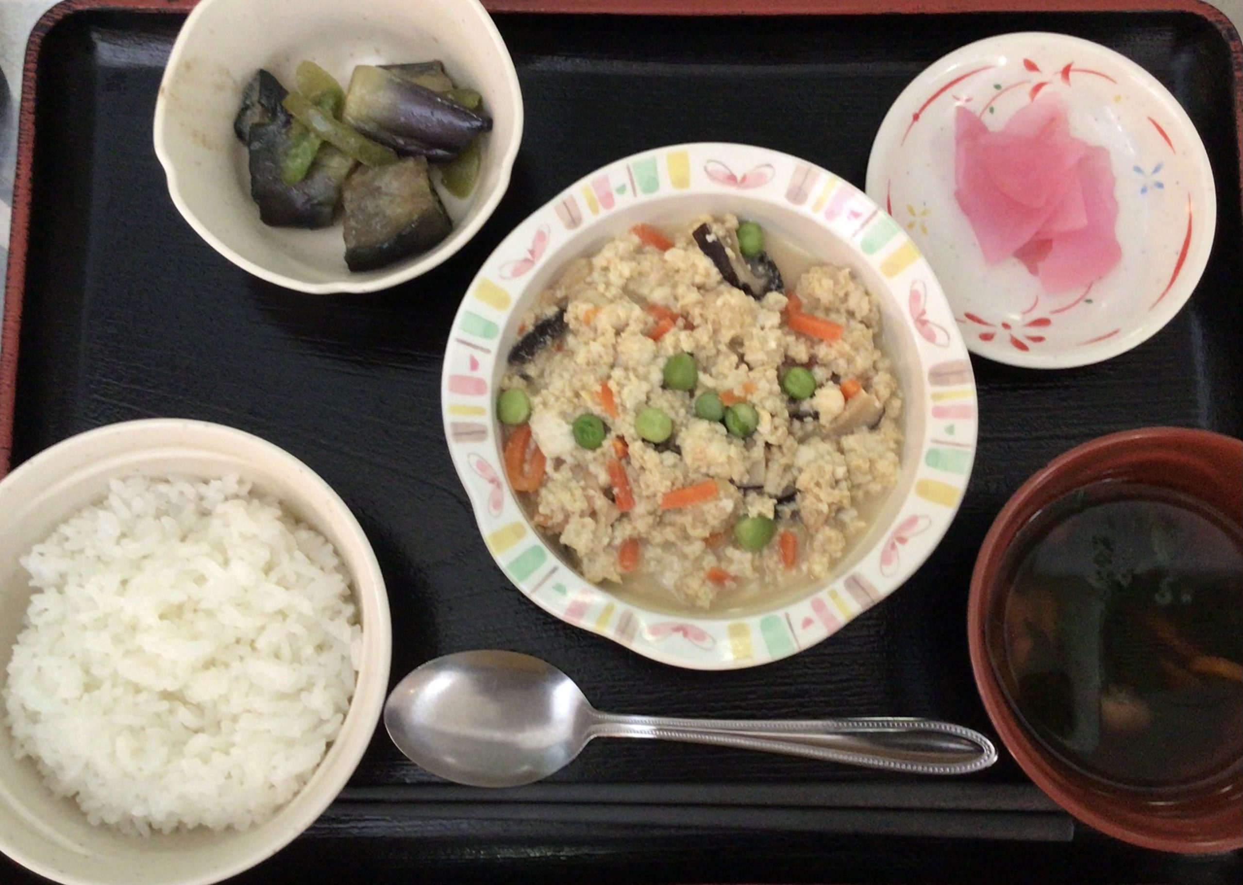 【昼食】 1.ご飯 2.炒り豆腐 3.茄子の味噌炒め 4.漬物 5.すまし汁