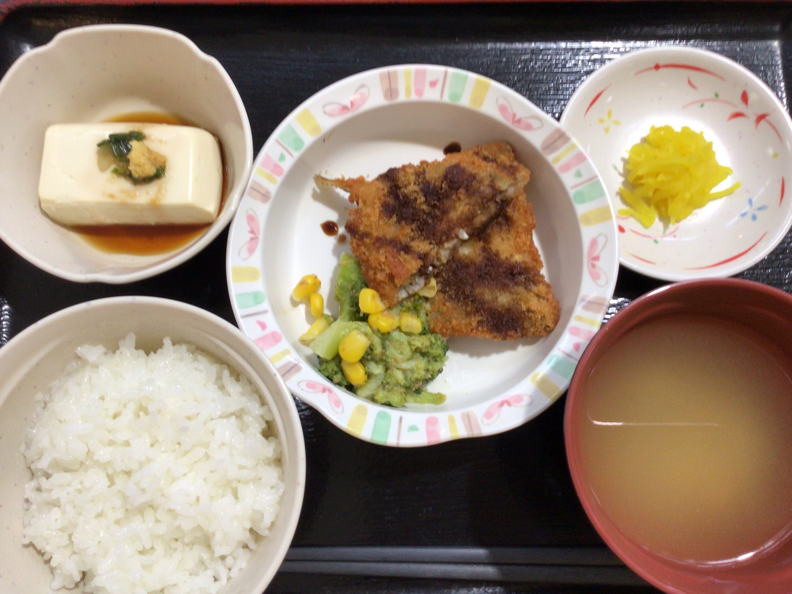【昼食】 1.ご飯 2.あじフライ 3.ブロッコリーごまドレかけ 4.奴 5.漬物 6.みそ汁