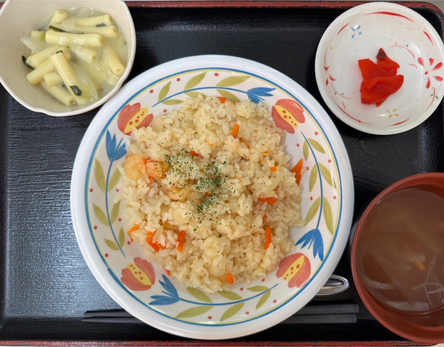 【昼食】 1.炊き込みエビピラフ 2.マカロニのクリーム煮 3.福神漬け 4.コンソメスープ