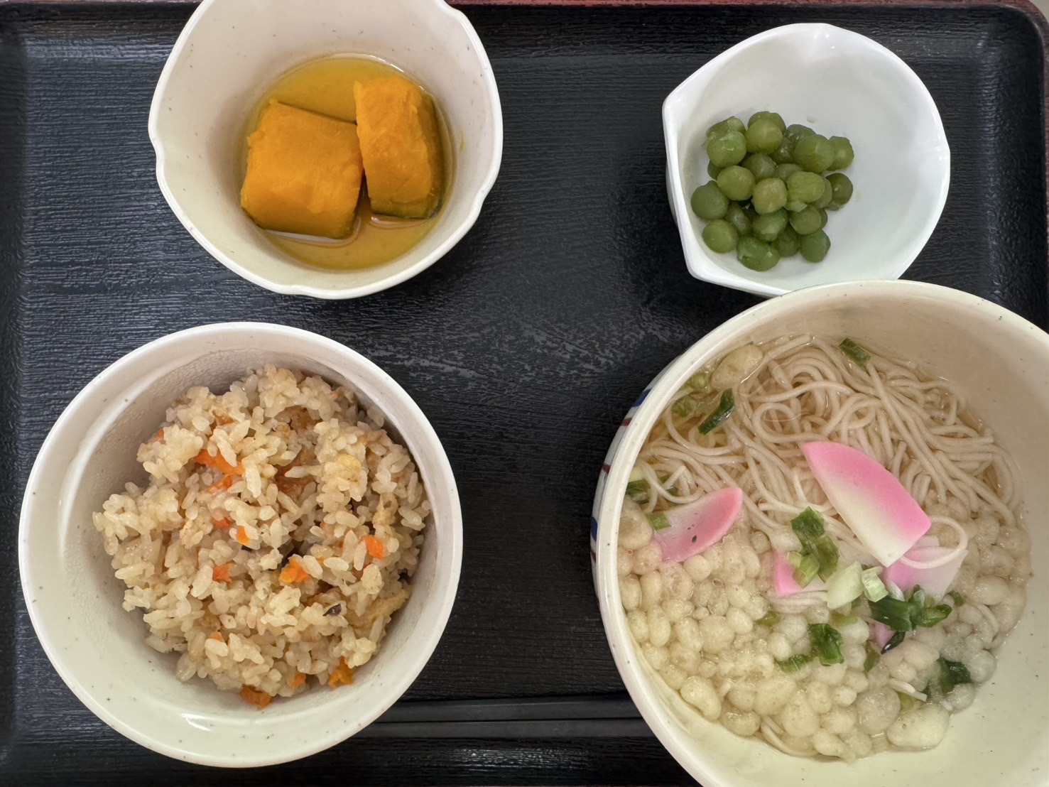 【昼食】 1.かやくご飯(小) 2.にゅう麺 3.かぼちゃ煮 4.うぐいす豆