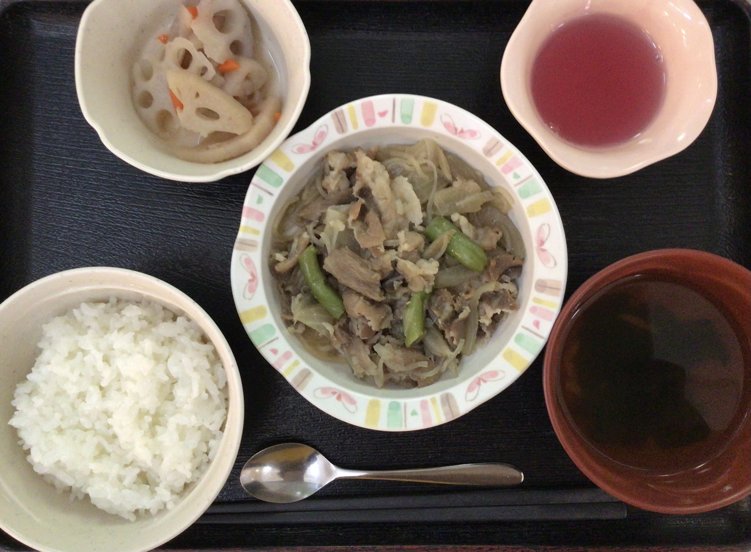 【昼食】 1.ご飯 2.豚肉とごぼうのしぐれ煮 3.れんこん甘酢 4.手作りゼリー 5.すまし汁