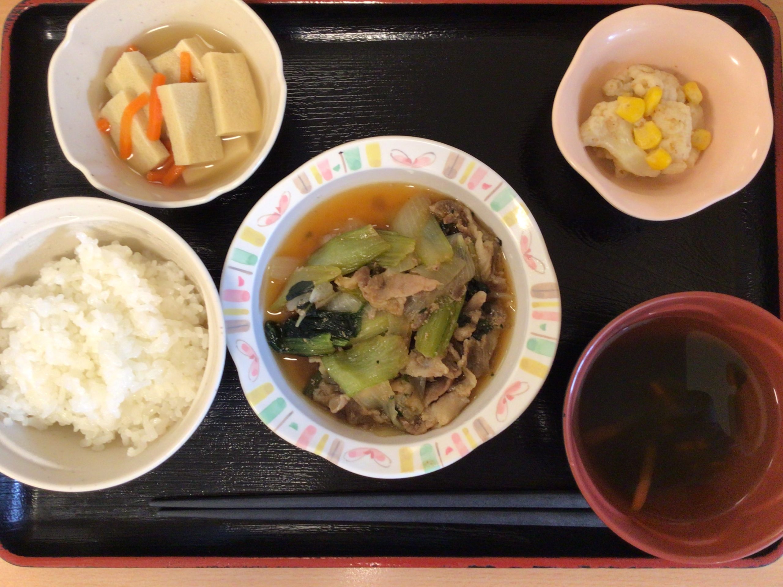 【昼食】 1.ご飯 2.豚肉のオイスター炒め 3.高野豆腐の煮物 4.カリフラワーサラダ 5.すまし汁