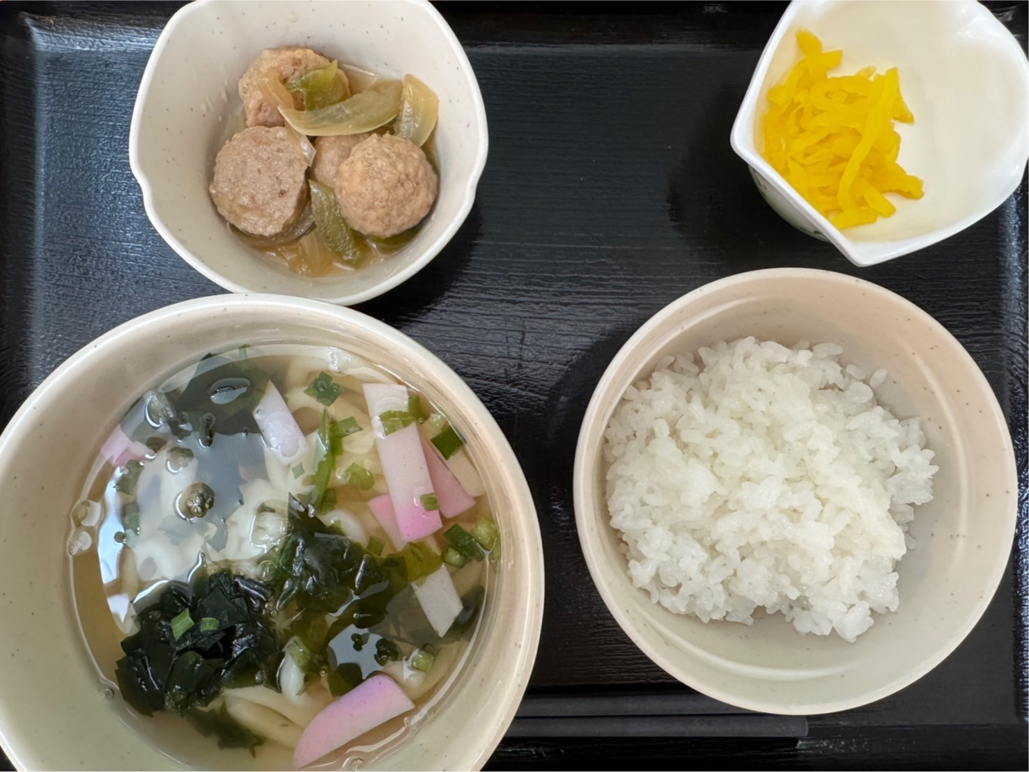 【昼食】 1.ご飯(小) 2.わかめうどん 3.肉団子甘煮 4.漬物