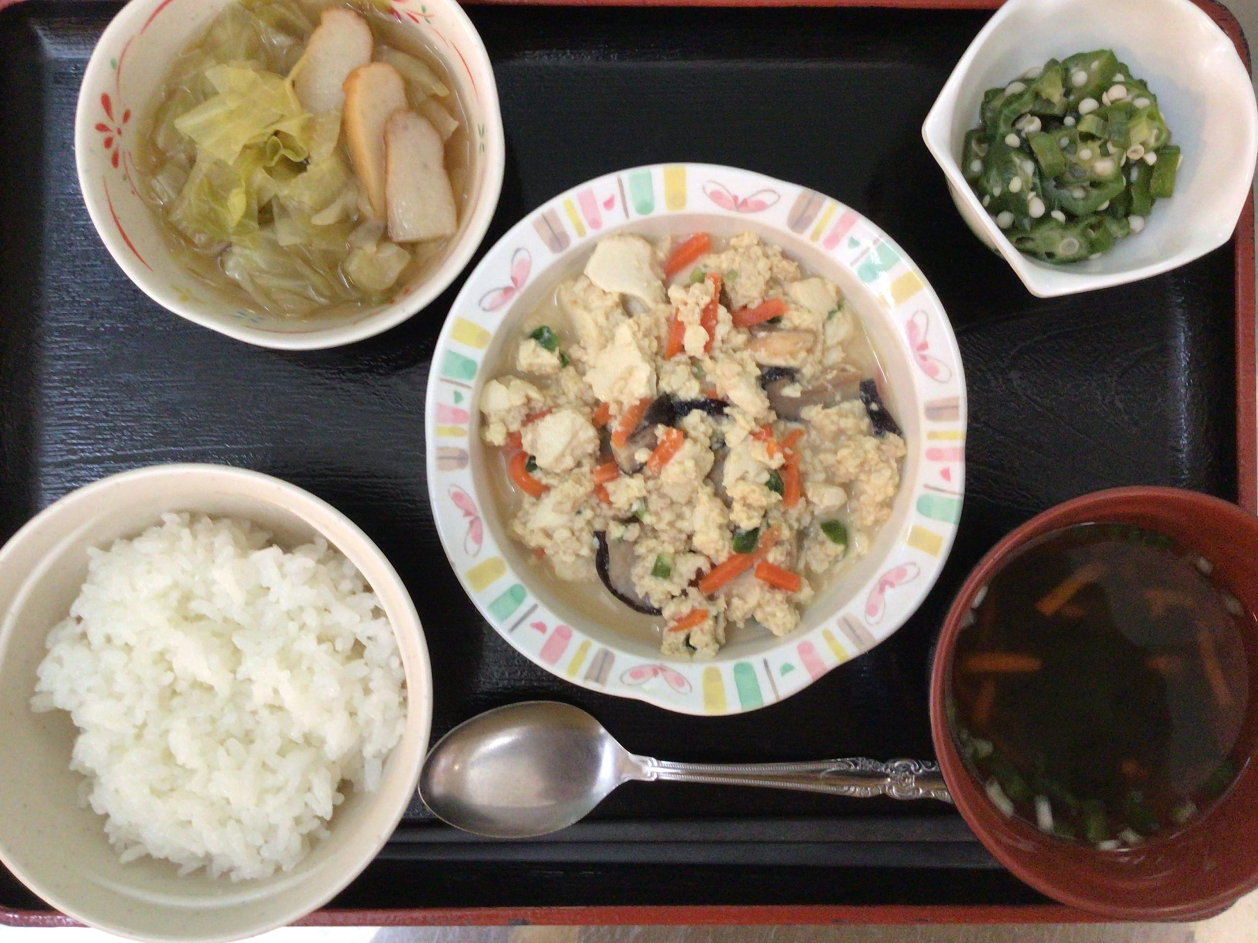 【昼食】 1.ご飯 2.炒り豆腐 3.キャベツ煮 4.オクラのポン酢 5.すまし汁