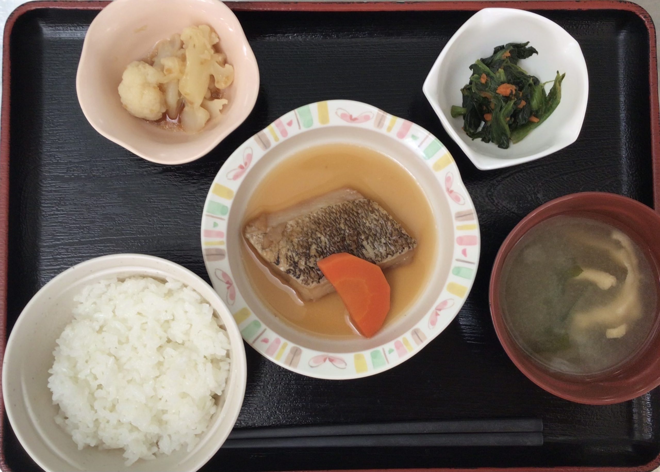 【昼食】 1.ご飯 2.かれいの煮つけ 3.ほうれん草ソテー 4.カリフラワーのドレ和え 5.みそ汁