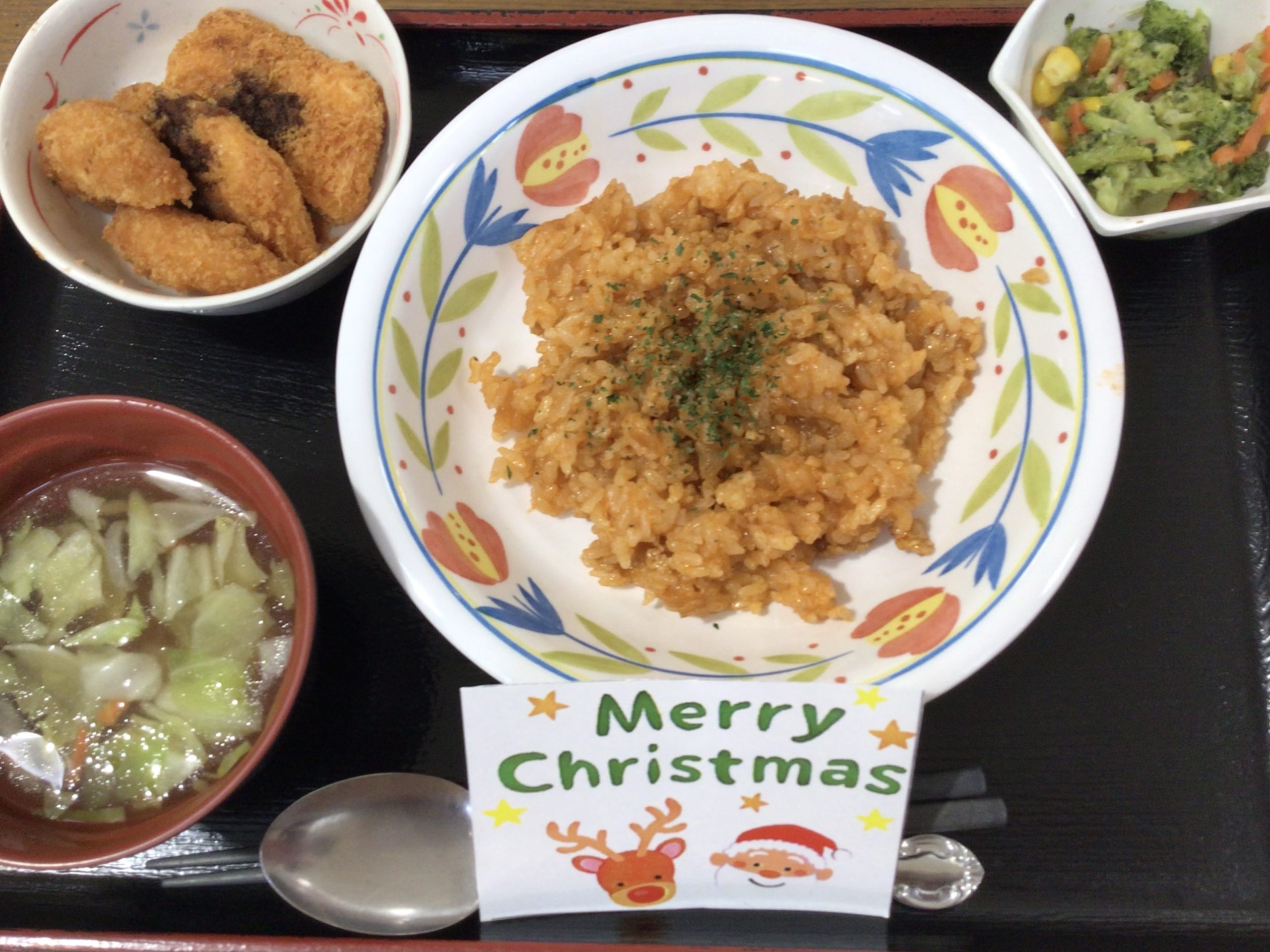 【昼食】 1.ケチャップライス 2.カニクリームコロッケ 3.チキンカツ 4.クリスマスサラダ 5.コンソメスープ