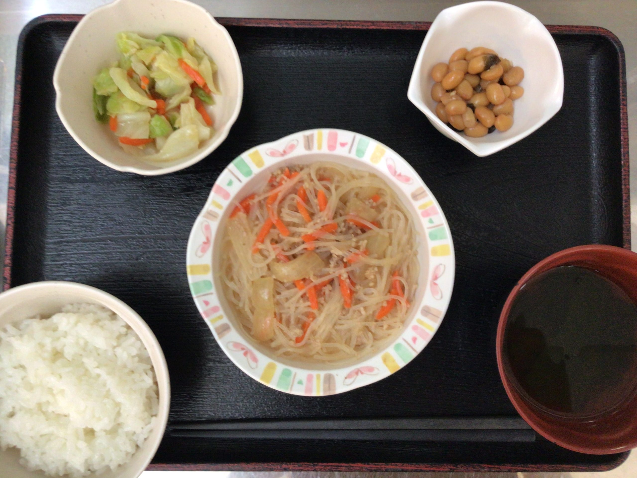 【昼食】 1.ご飯 2.春雨とひき肉の中華炒め 3.ナムル 4.やさい豆 5.すまし汁