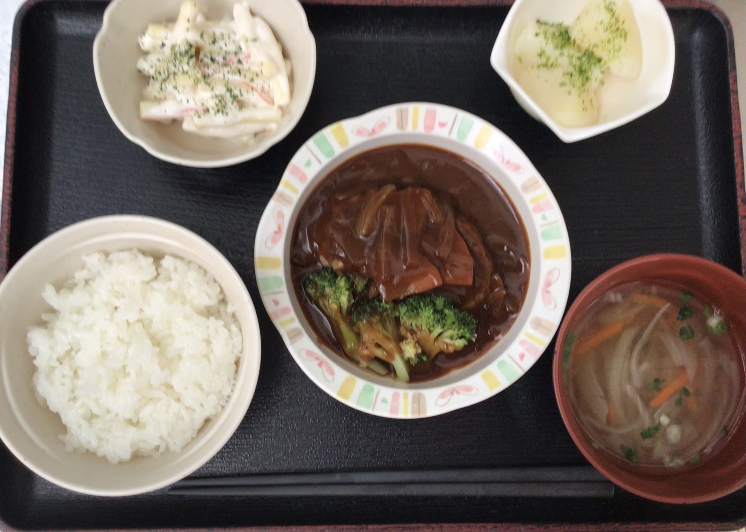【昼食】 1.ご飯 2.煮込みハンバーグ 3.マカロニサラダ 4.粉ふきいも 5.コンソメスープ