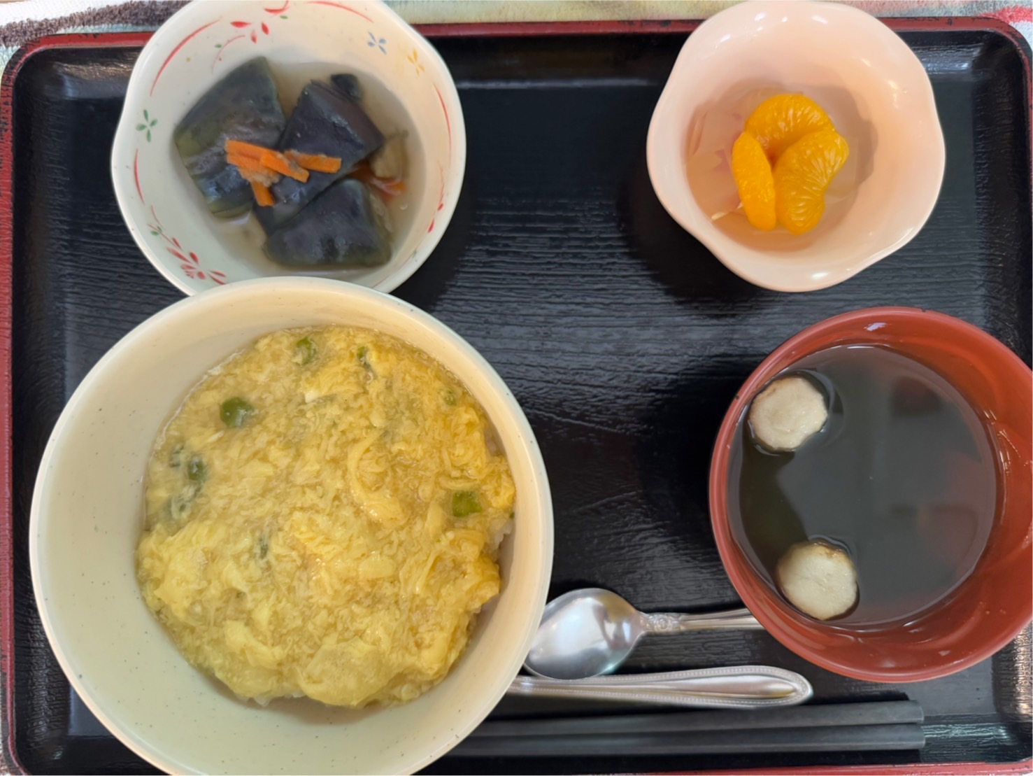 【昼食】 1.卵あんかけ丼 2.茄子の煮物 3.フルーツ寒天 4.すまし汁
