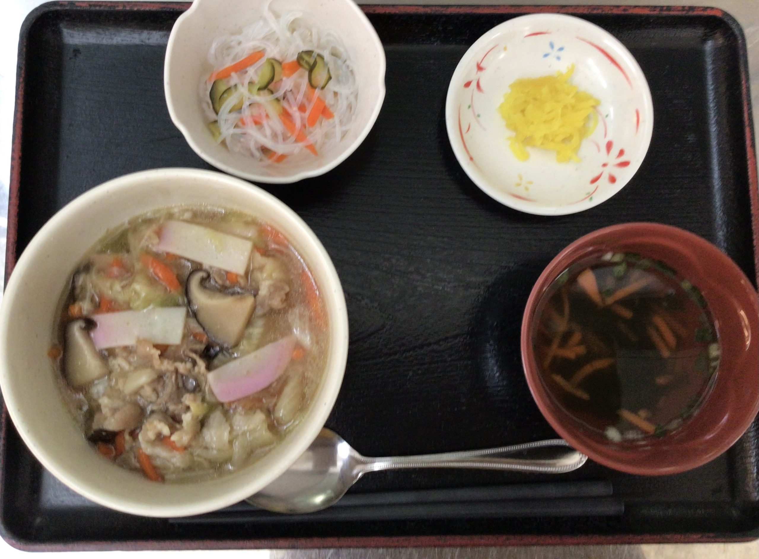 【昼食】 1.中華丼 2.春雨酢 3.漬物 4.すまし汁