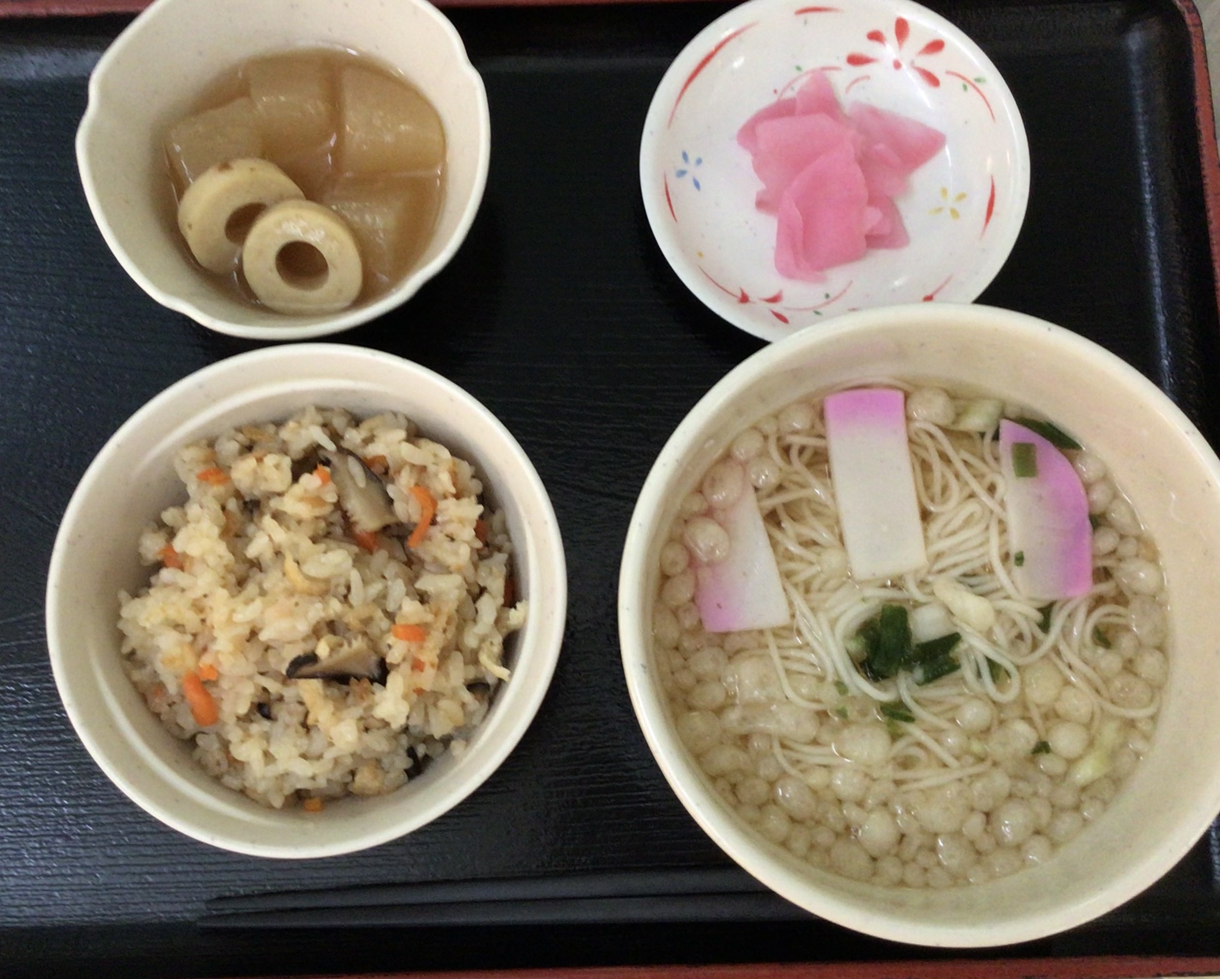 【昼食】 1.炊き込みご飯(小) 2.にゅう麺 3.大根の煮物 4.漬物