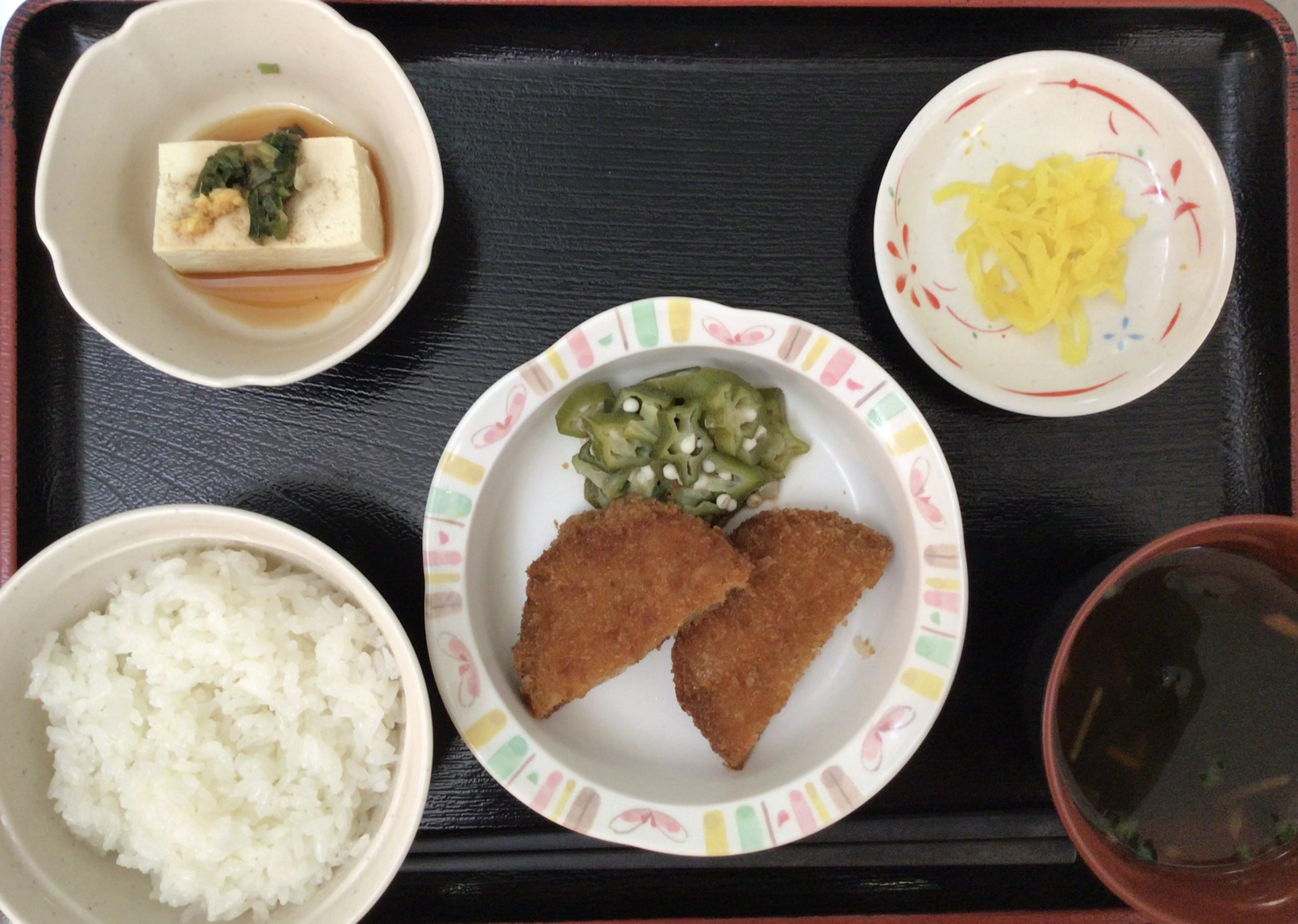 【昼食】 1.ご飯 2.メンチカツ 3.オクラのポン酢和え 4.奴 5.漬物 6.すまし汁