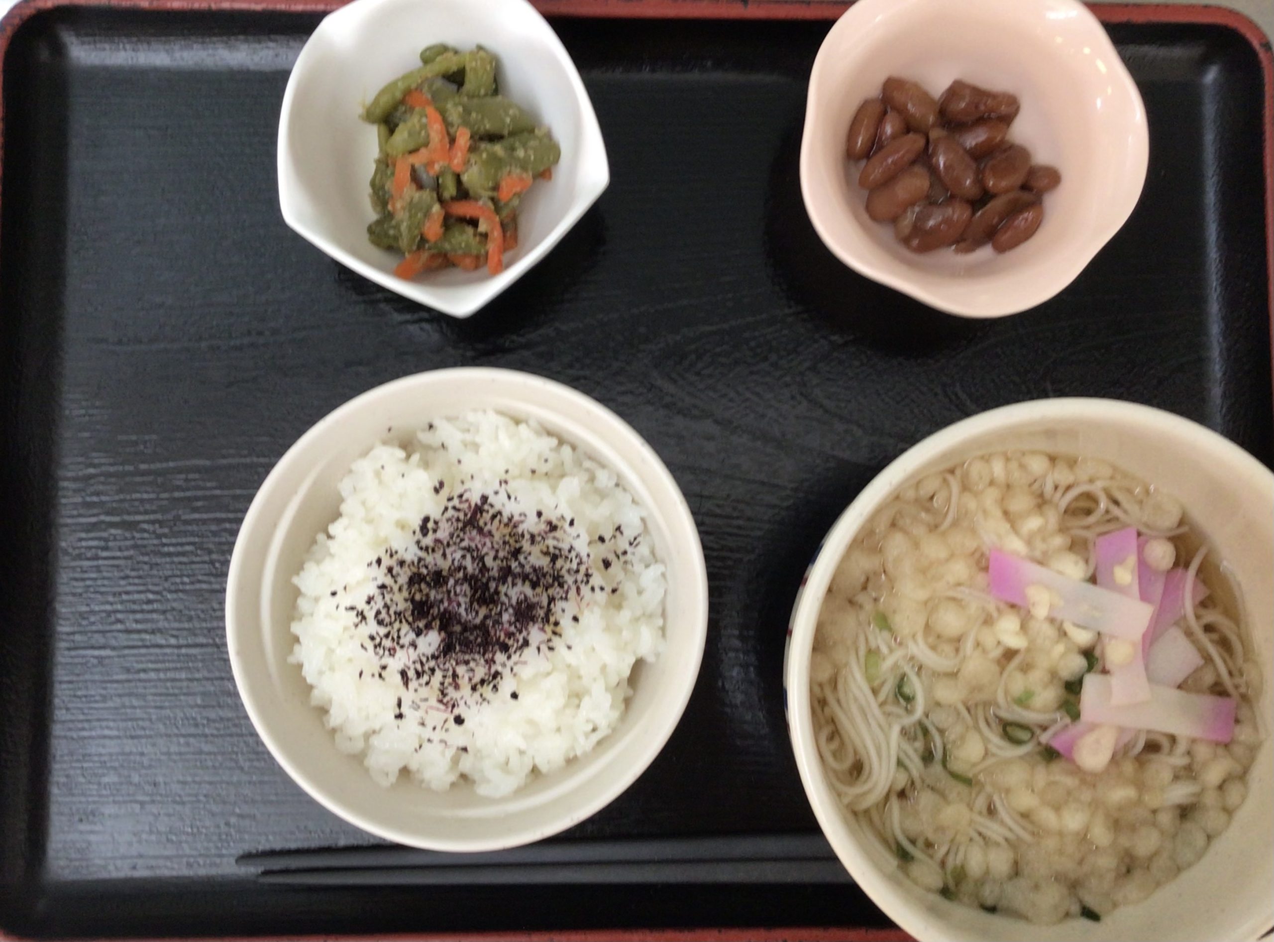 【昼食】 1.ゆかりご飯(小) 2.にゅう麺 3.いんげんのごま和え 4.金時豆