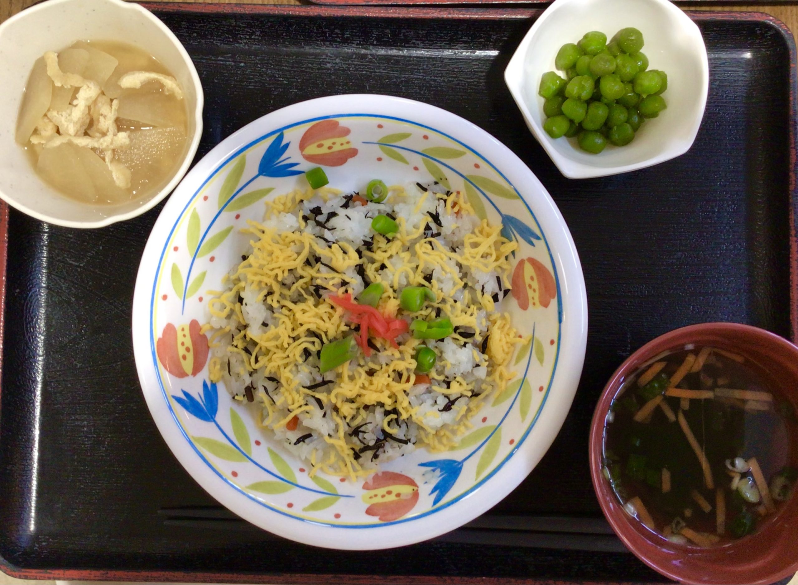 【昼食】 1.ひじきチラシ寿司 2.大根の煮物 3.うぐいす豆 4.すまし汁