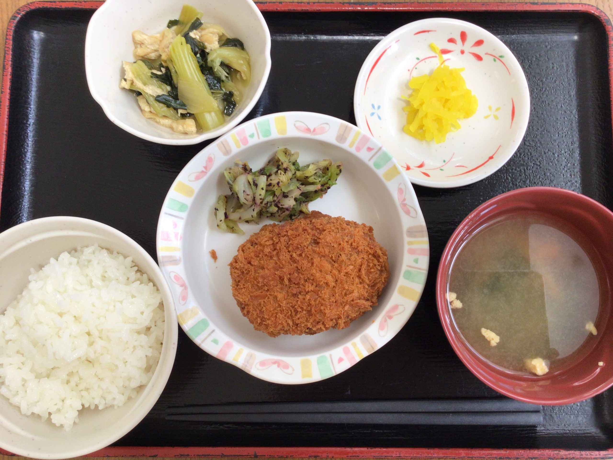 【昼食】 1.ご飯 2.かぼちゃコロッケ 3.キャベツゆかり和え 4.青梗菜煮浸し 5.漬物 6.みそ汁