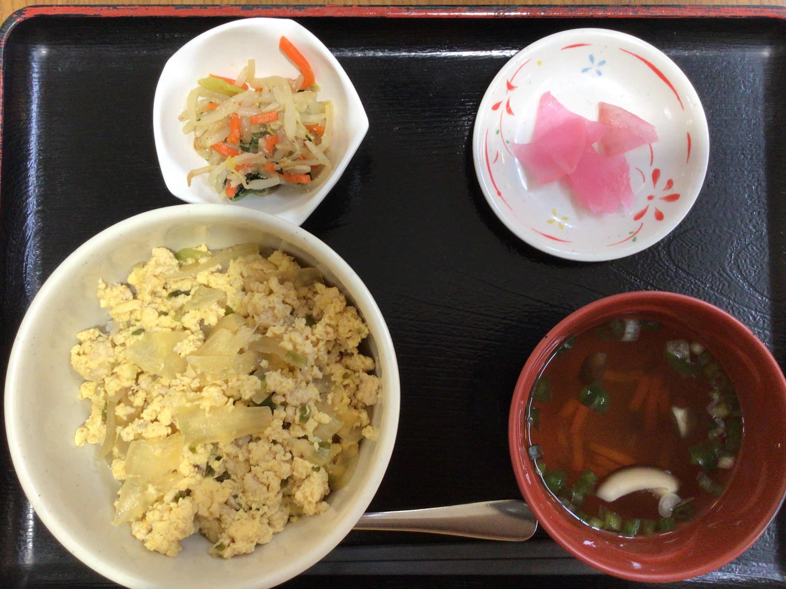 【昼食】 1.甘辛ミンチの卵とじ丼 2.ナムル 3.漬物 4.すまし汁