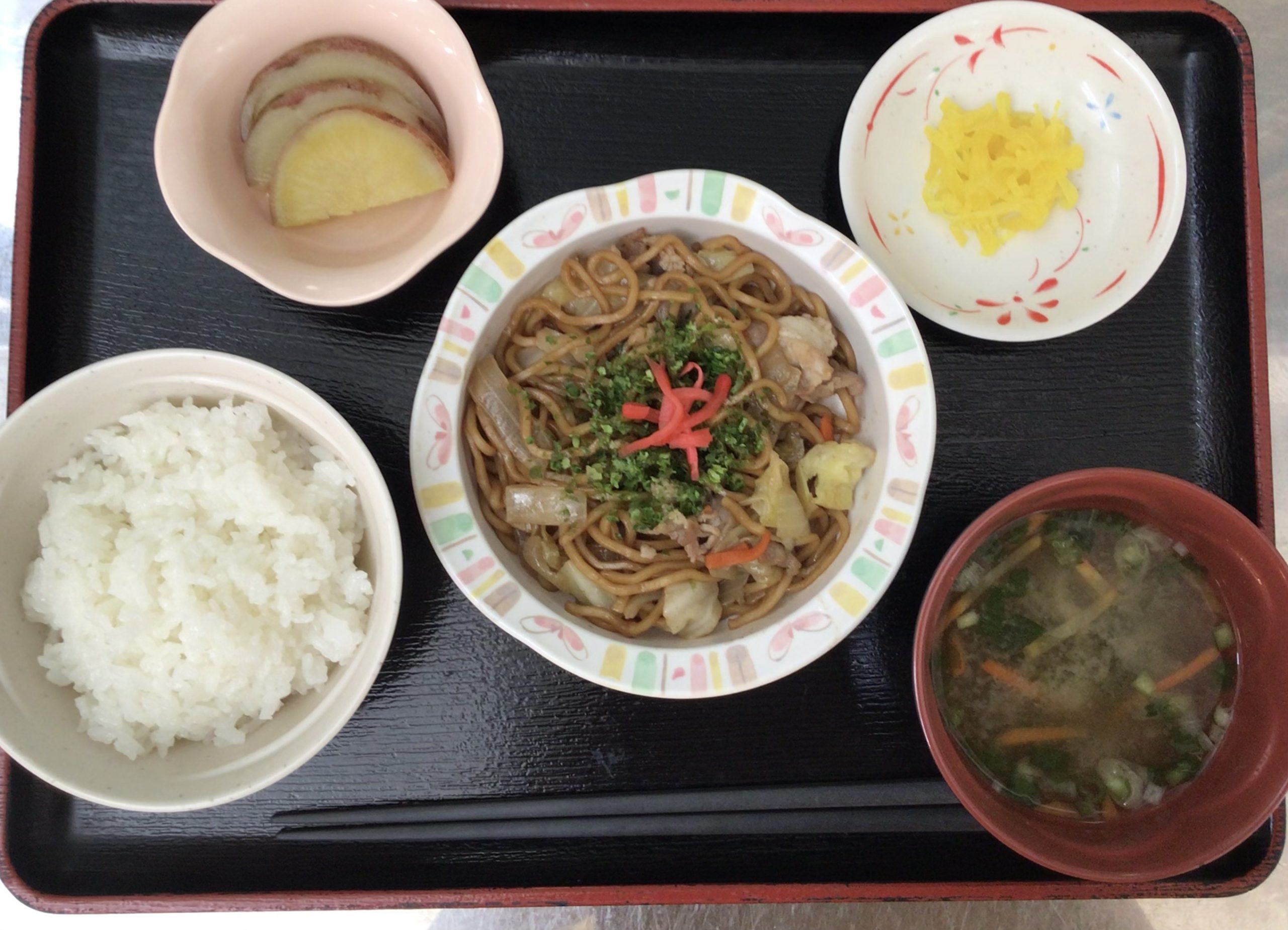 【昼食】 1.ご飯(小) 2.焼きそば 3.さつまいものレモン煮 4.漬物 5.みそ汁