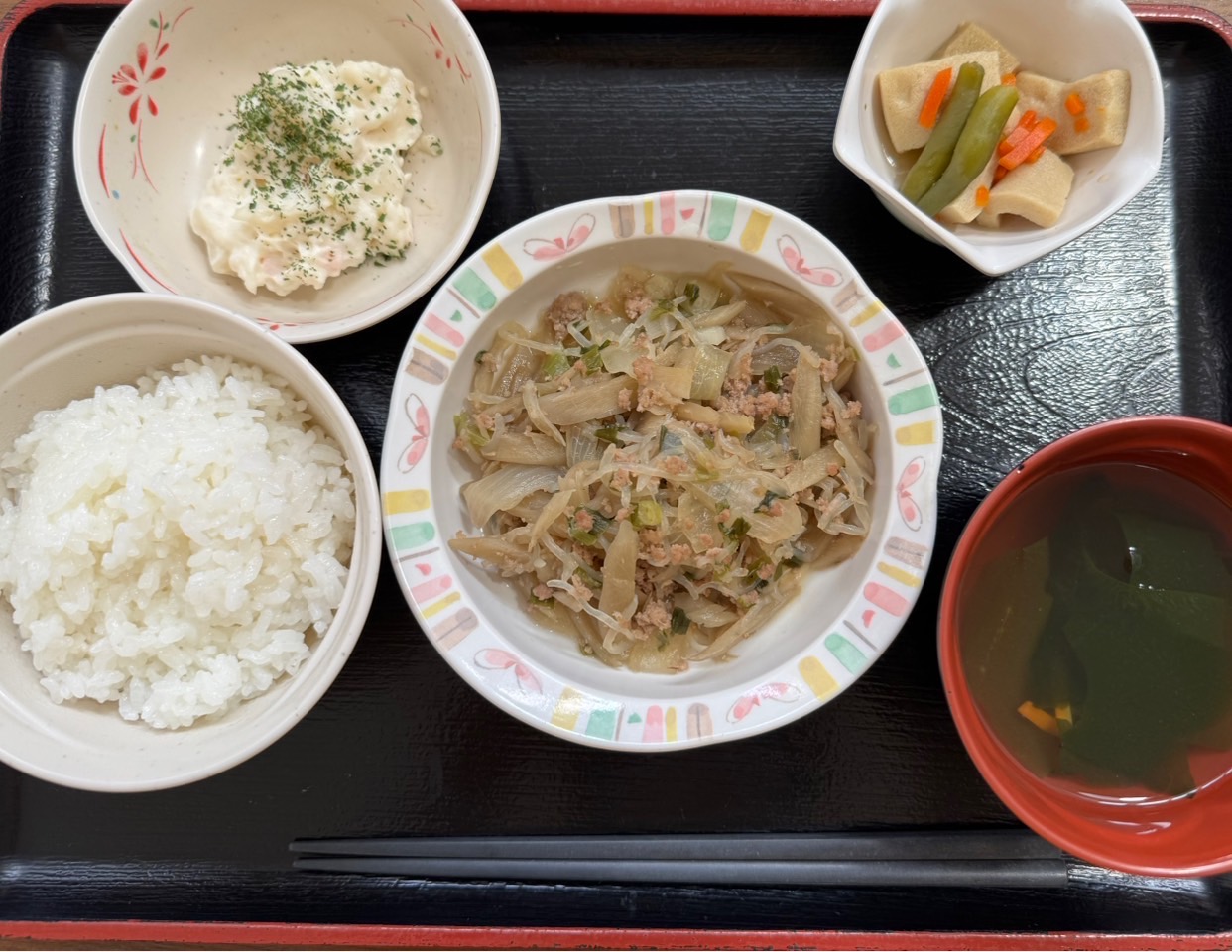 【昼食】 1.ご飯 2.ごぼうのそぼろ煮 3.ポテトサラダ 4.高野豆腐の短冊煮 5.すまし汁