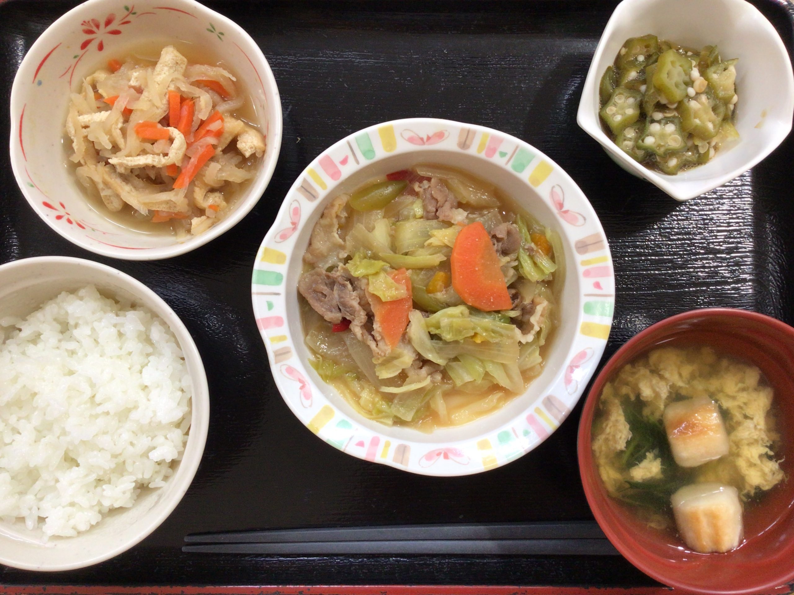【昼食】 1.ご飯 2.豚肉と野菜の味噌炒め 3.切干し大根の煮物 4.オクラのポン酢和え 5.すまし汁