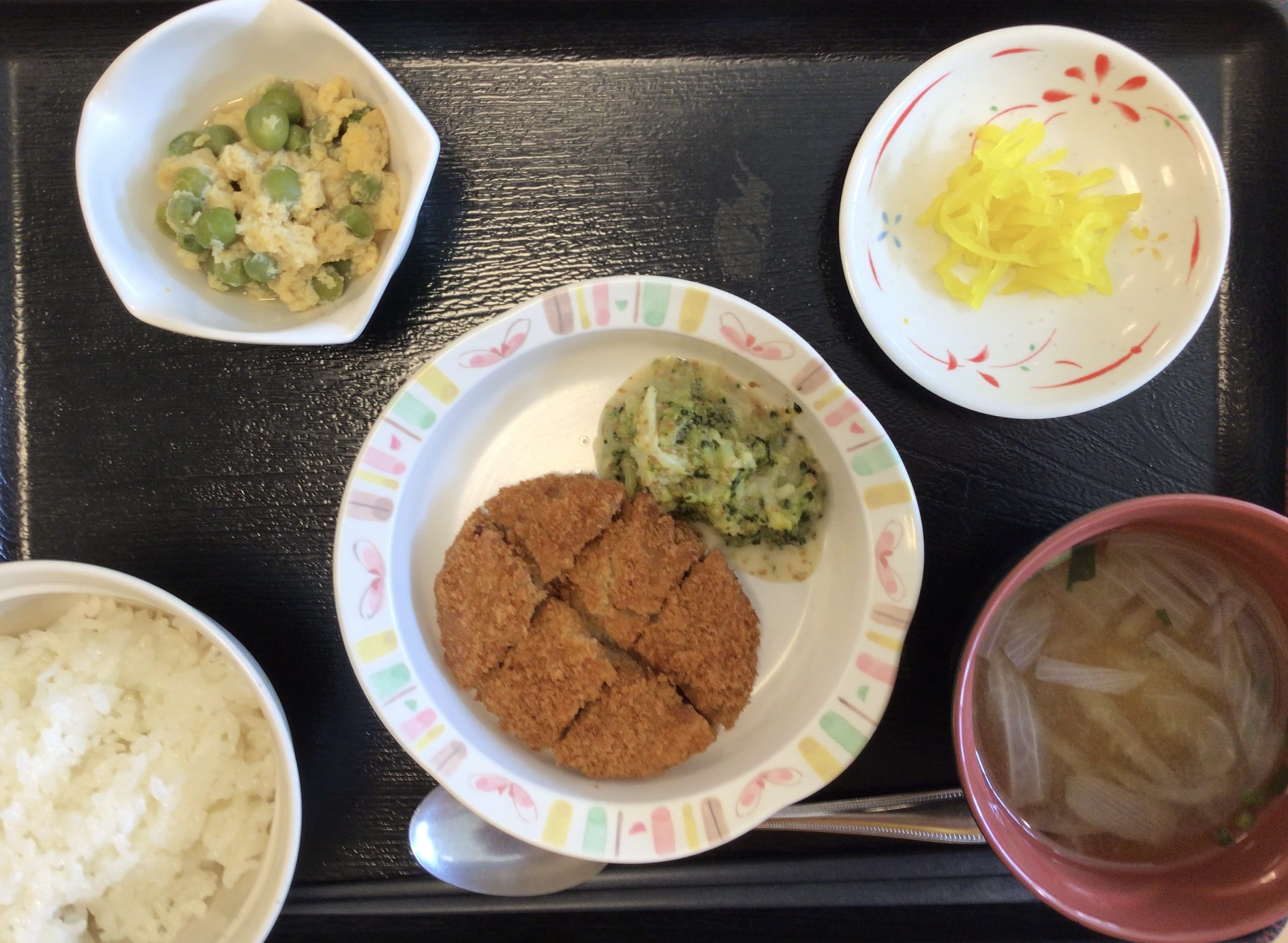 【昼食】 1.ご飯 2.コロッケ 3.ブロッコリーごま和え 4.豆の卵とじ 5.漬物 6.みそ汁