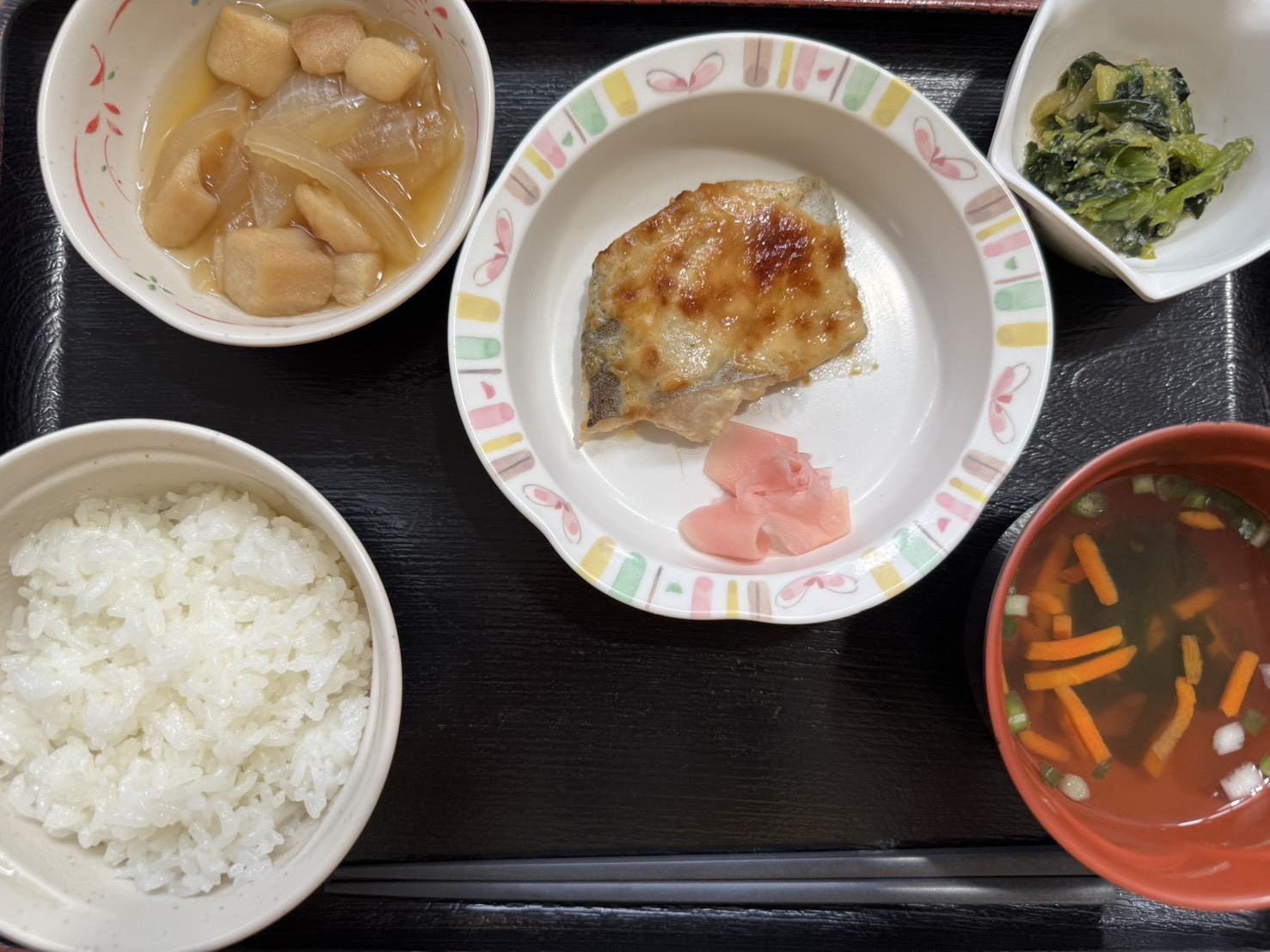 【昼食】 1.ご飯 2.魚味噌マヨネーズ焼き 3.麩と玉葱の煮物 4.青梗菜ごま和え 5.すまし汁