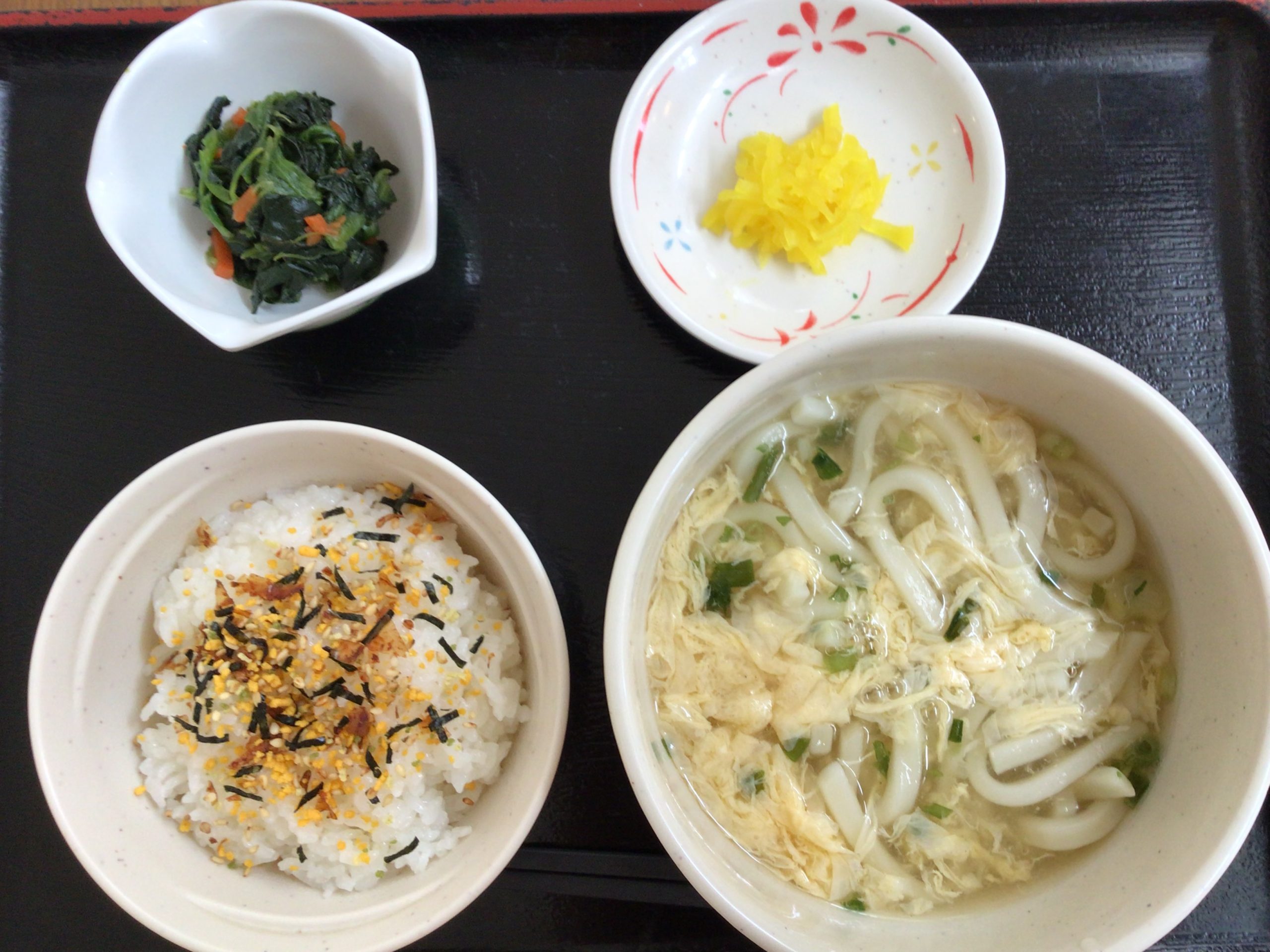 【昼食】 1.ふりかけご飯(小) 2.卵あんかけうどん 3.青菜炒め 4.漬物