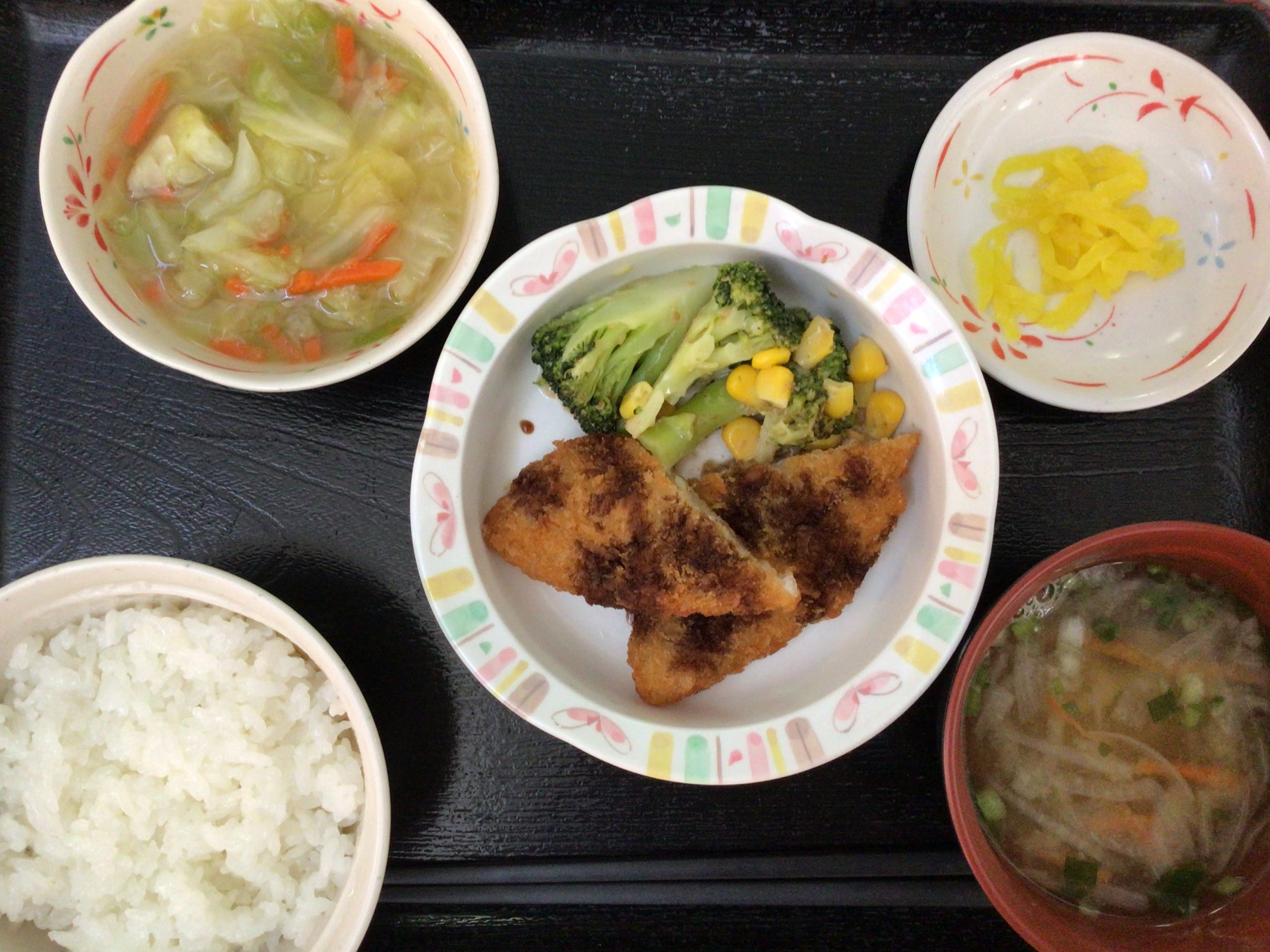 【昼食】 1.ご飯 2.白身魚のフライ 3.ブロッコリーゴマドレかけ 4.キャベツのくず煮 5.漬物 6.みそ汁