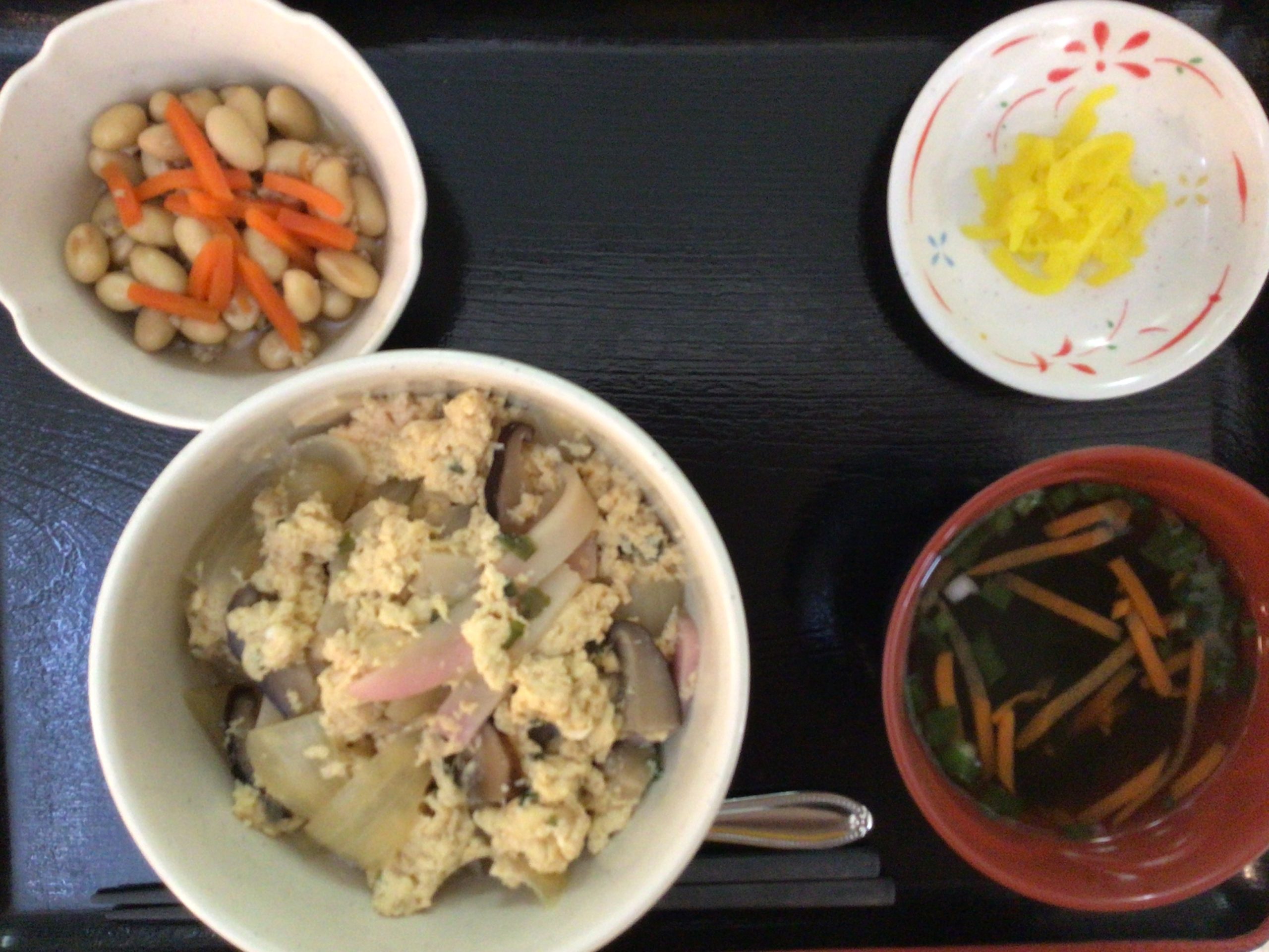 【昼食】 1.木の葉丼 2.豚と大豆うま煮 3.漬物 4.すまし汁