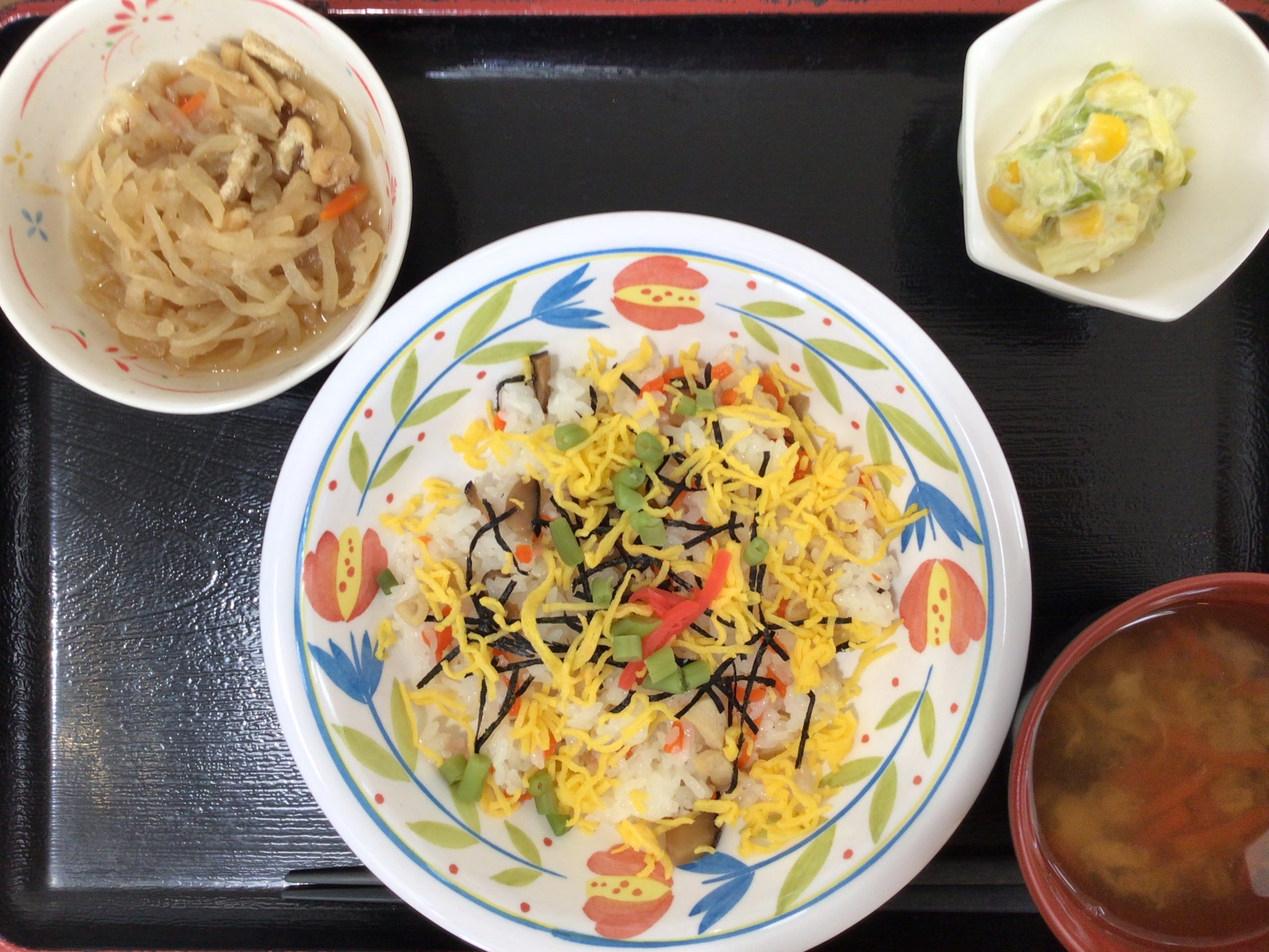 【昼食】 1.五目ちらし寿司 2.切干し大根の煮物 3.キャベツ辛子マヨ和え 4.すまし汁