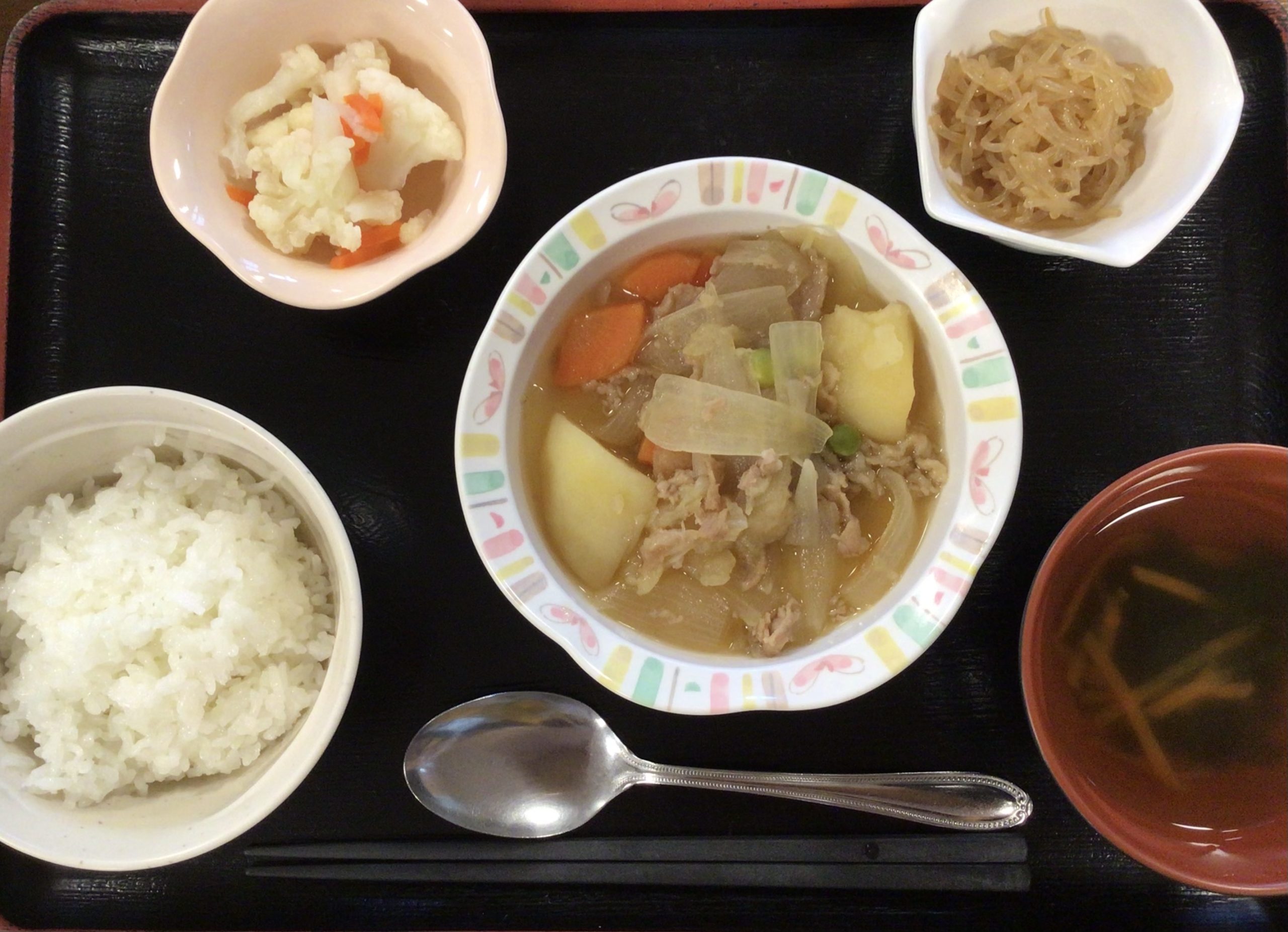 【昼食】 1.ご飯 2.肉じゃが 3.カリフラワーの甘酢和え 4.糸こんピリ辛炒め 5.すまし汁