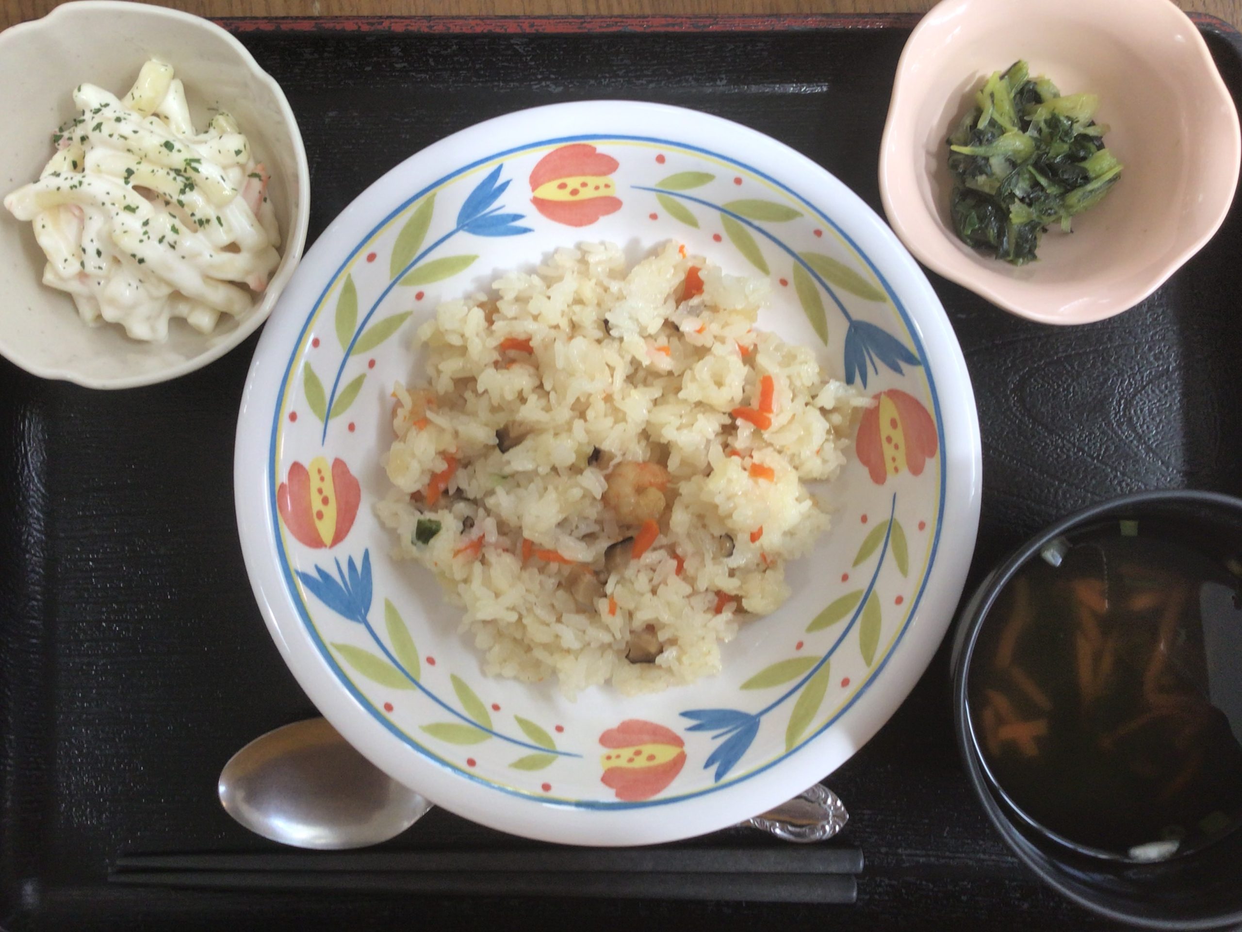 【昼食】 1.中華風炊き込みピラフ 2.マカロニサラダ 3.青菜炒め 4.すまし汁