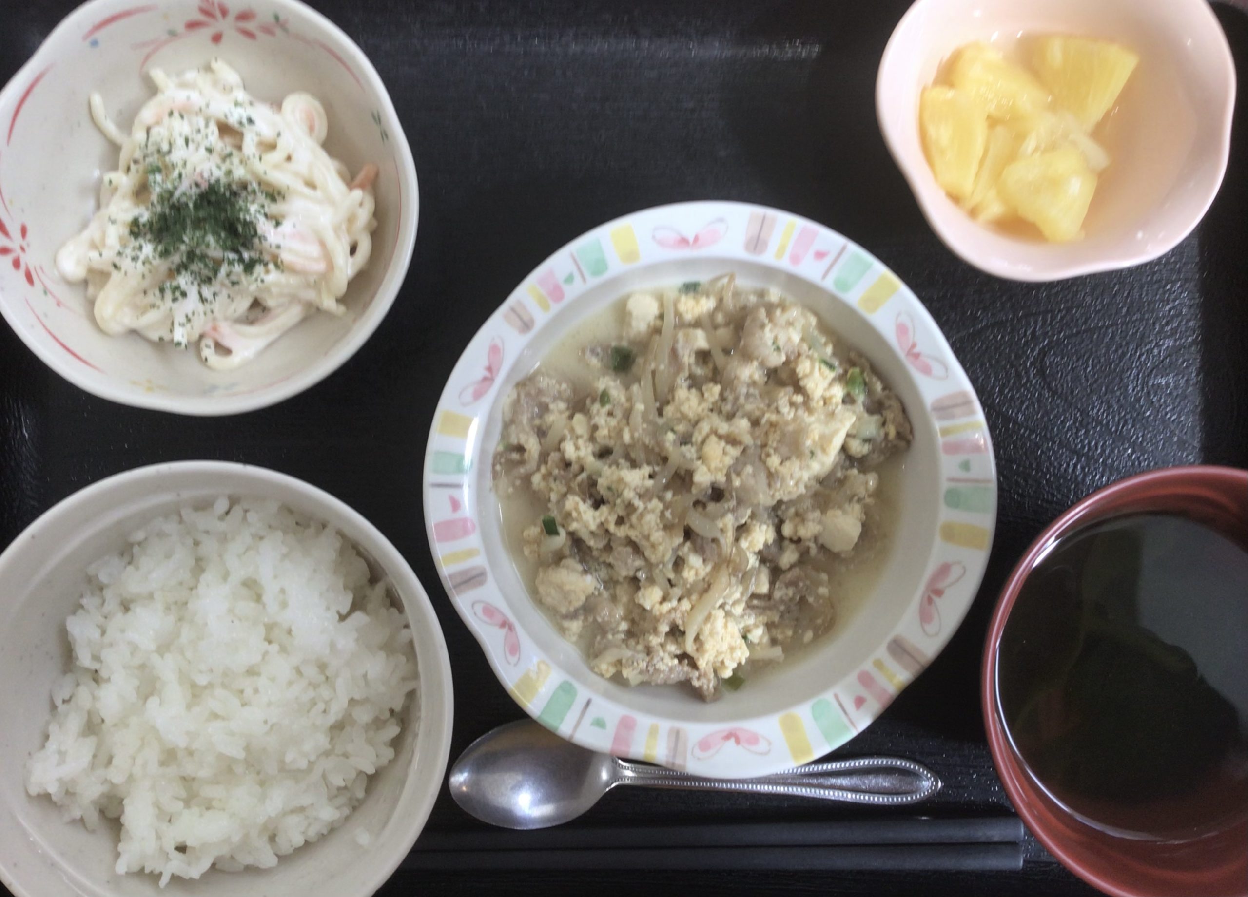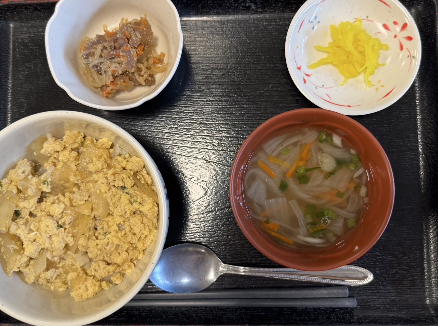 【昼食】 1.親子丼 2.れんこんのきんぴら 3.漬物 4.みそ汁