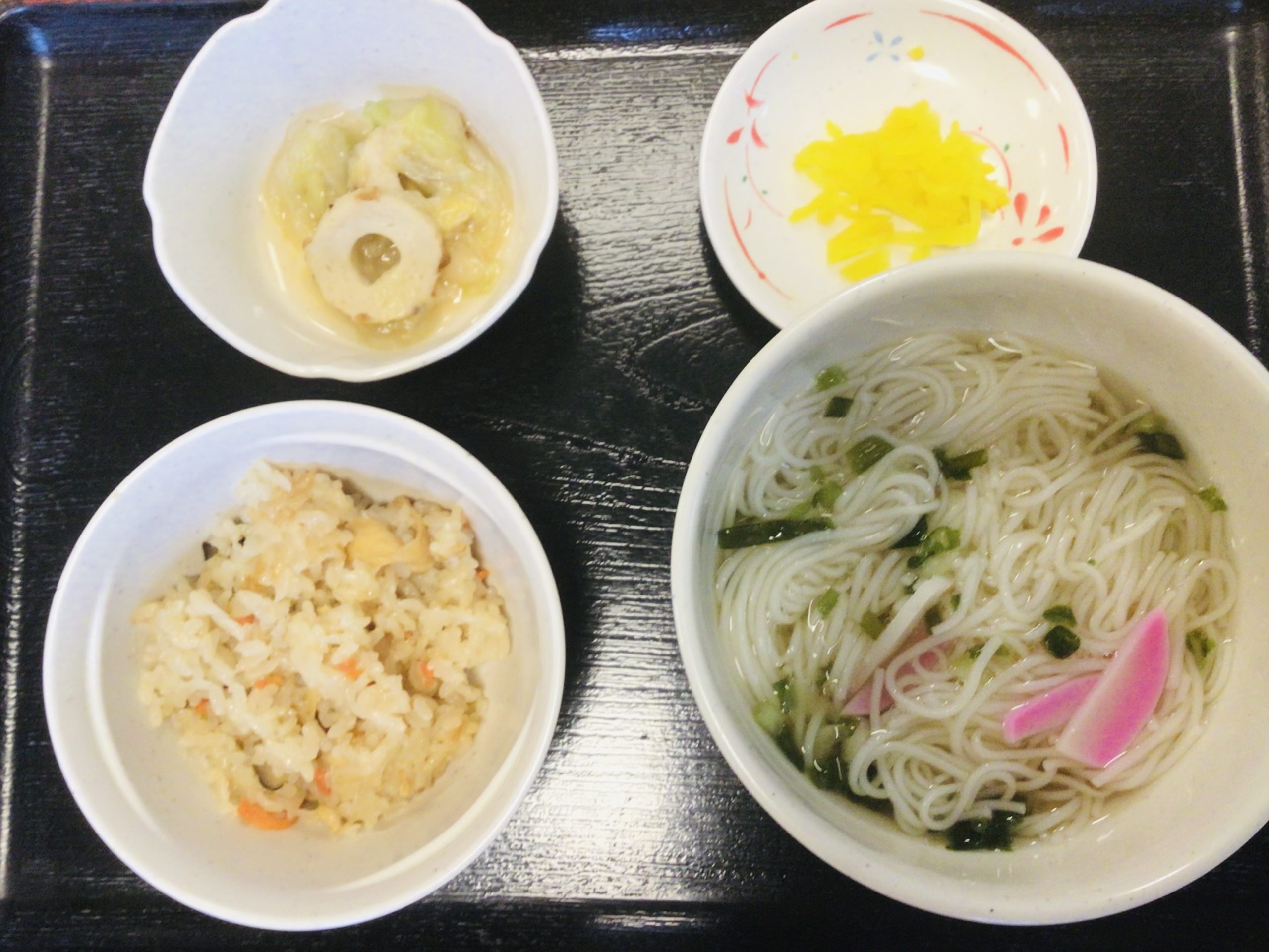 【昼食】 1.かやくご飯(小) 2.にゅう麺 3.白菜の煮物 4.漬物