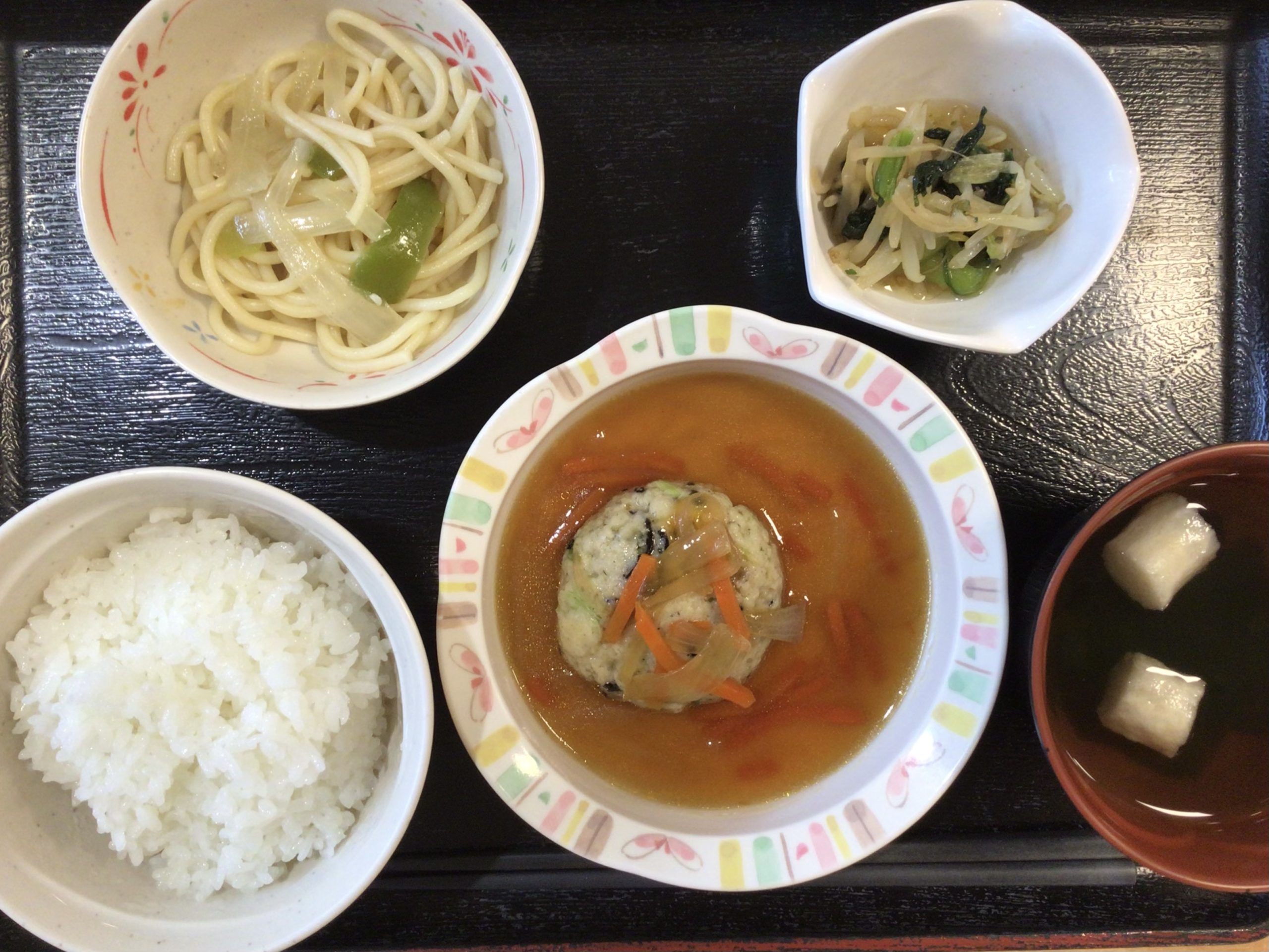 【昼食】 1.ご飯 2.照り焼き豆腐ハンバーグ 3.スパゲティソテー 4.華風和え 5.すまし汁