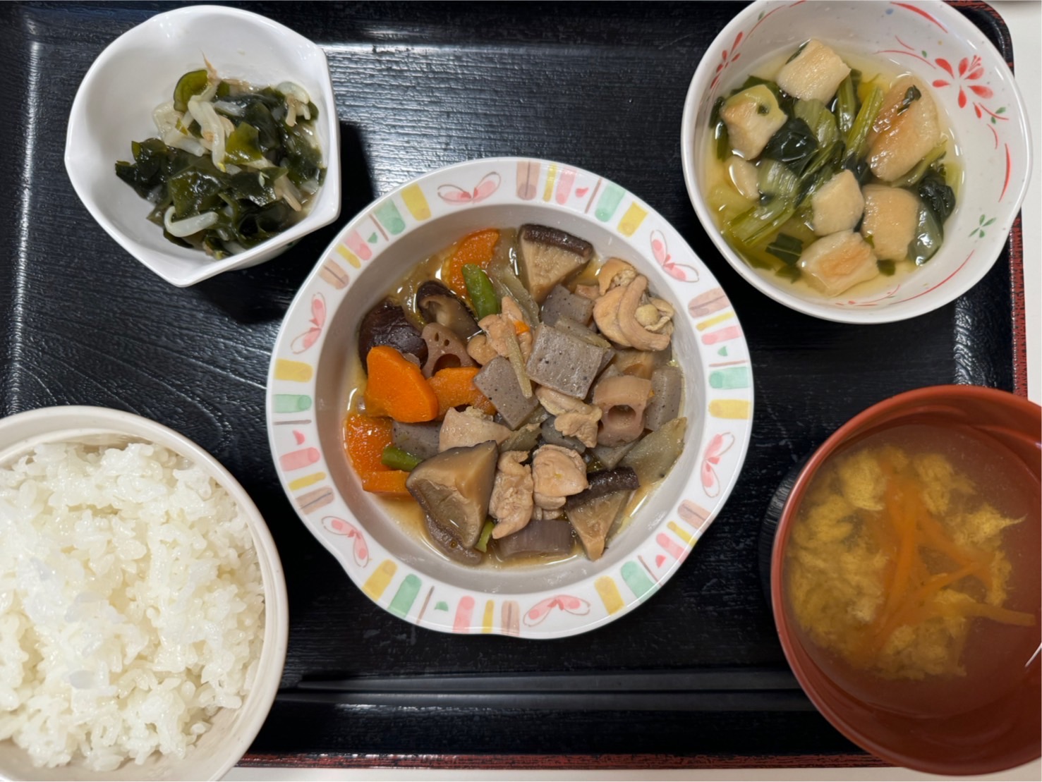 【昼食】 1.ご飯 2.炒り鶏 3.麩と小松菜煮 4.海藻サラダ 5.すまし汁