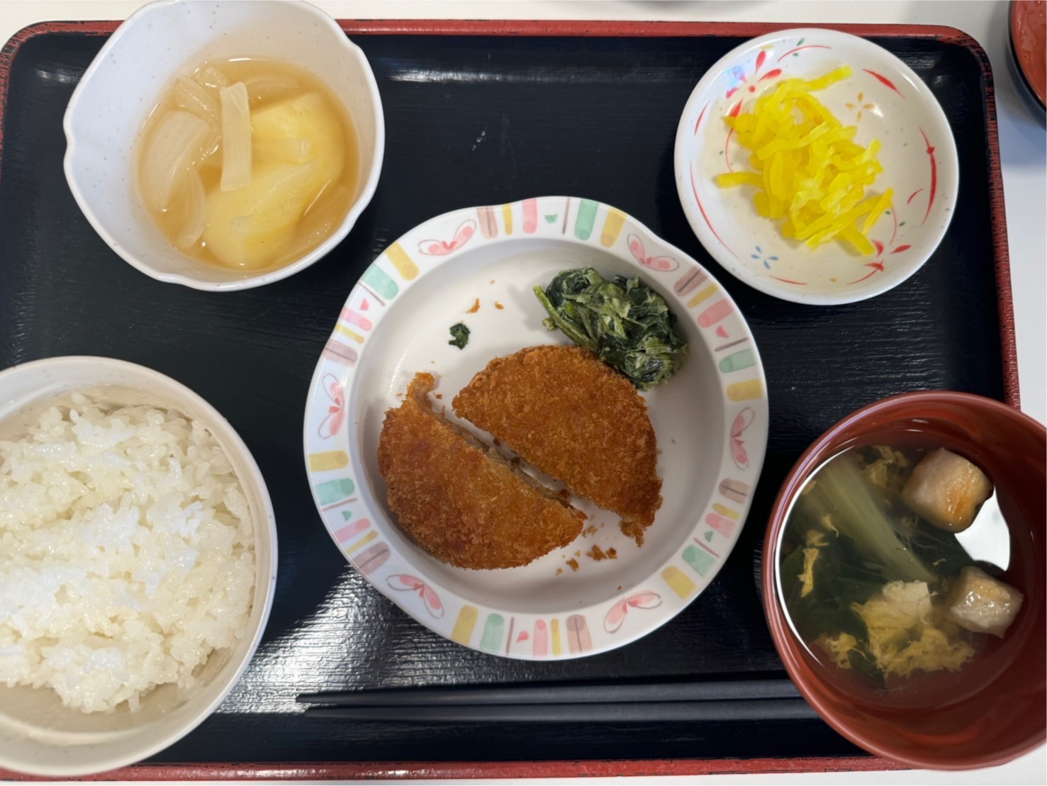 【昼食】 1.ご飯 2.メンチカツ 3.ほうれん草マヨネーズ和え 4.じゃがいものコンソメ煮 5.漬物 6.すまし汁