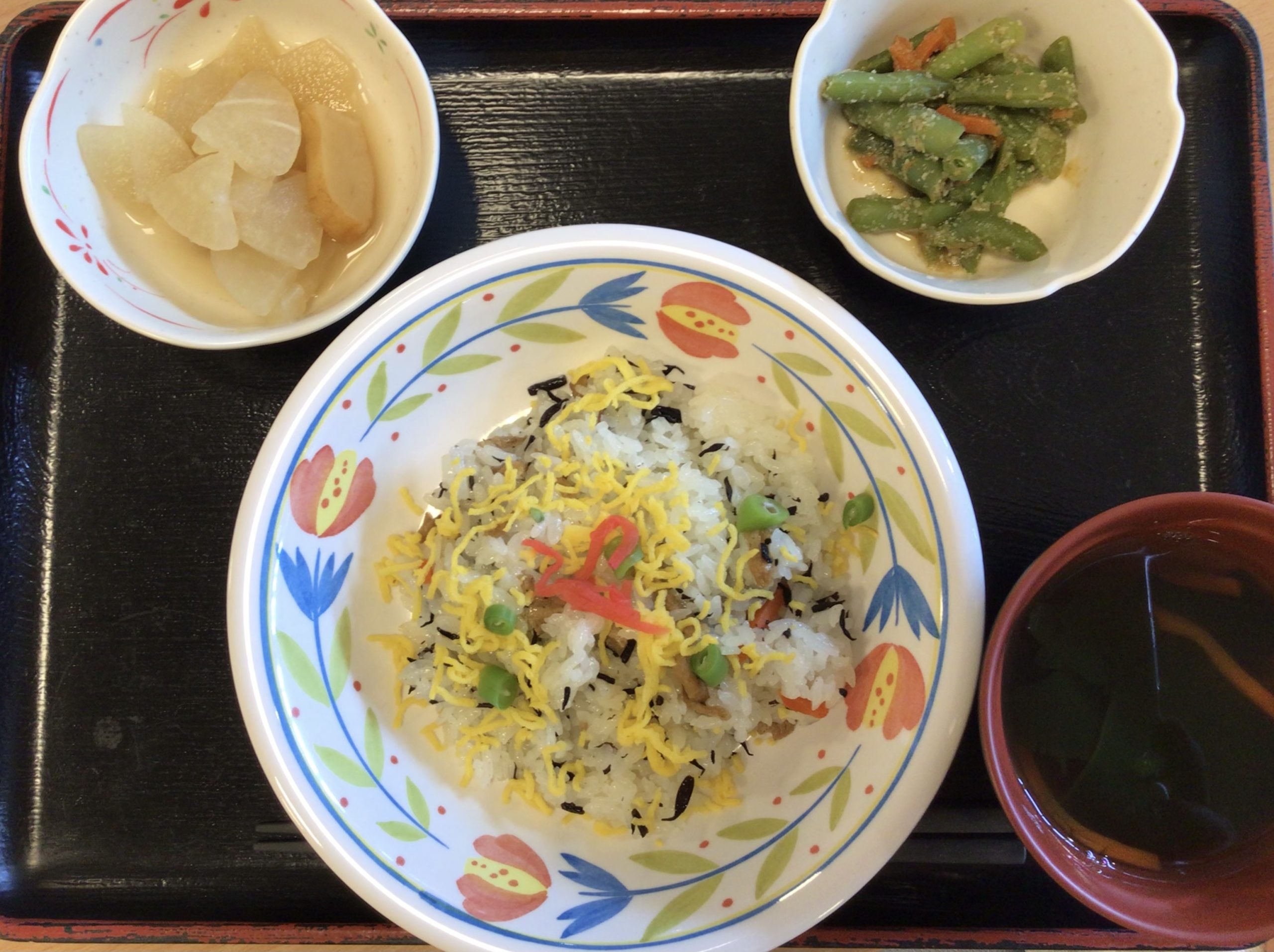 【昼食】 1.ひじきチラシ寿司 2.大根の煮物 3.いんげんのごま和え 4.すまし汁