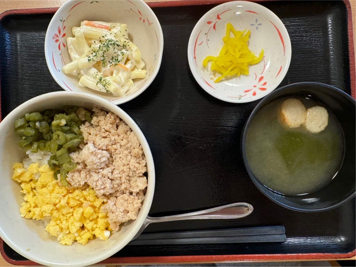 【昼食】 1.三色そぼろ丼 2.マカロニサラダ 3.漬物 4.みそ汁