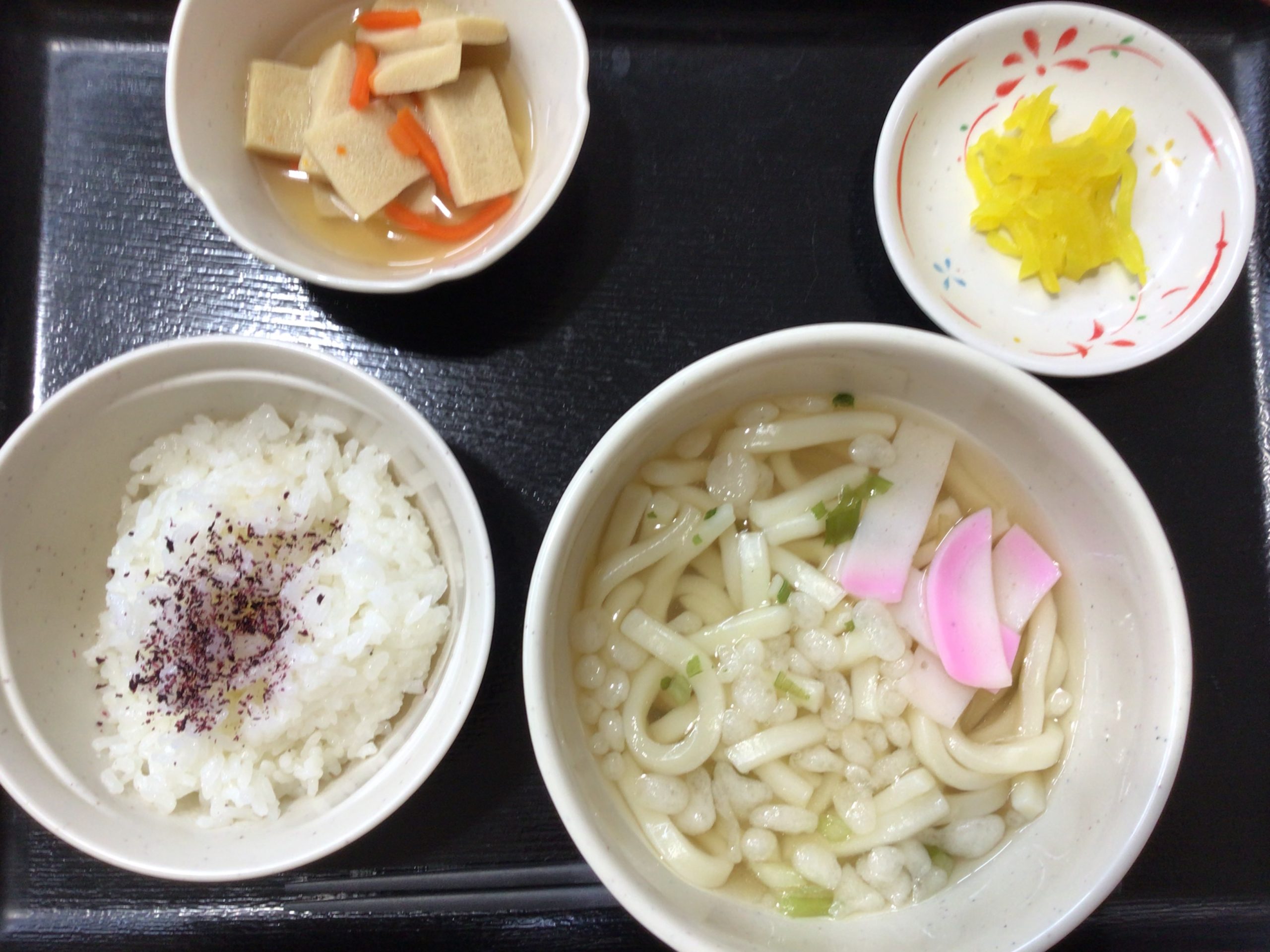 【昼食】 1.ゆかりご飯(小) 2.ハイカラうどん 3.高野豆腐の煮物 4.漬物