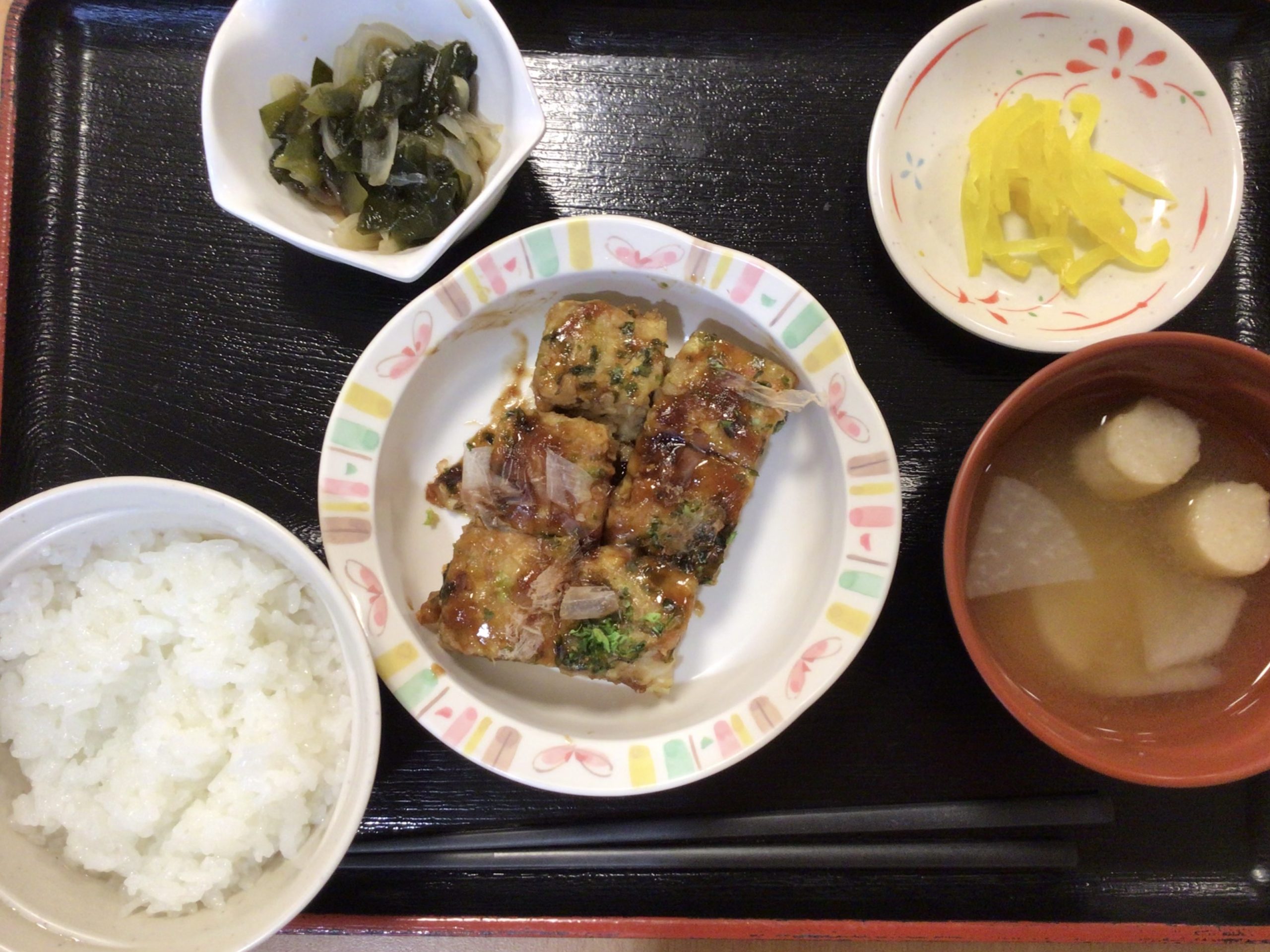 【昼食】 1.ご飯(小) 2.お好み焼き 3.玉葱と若布のポン酢和え 4.漬物 5.みそ汁