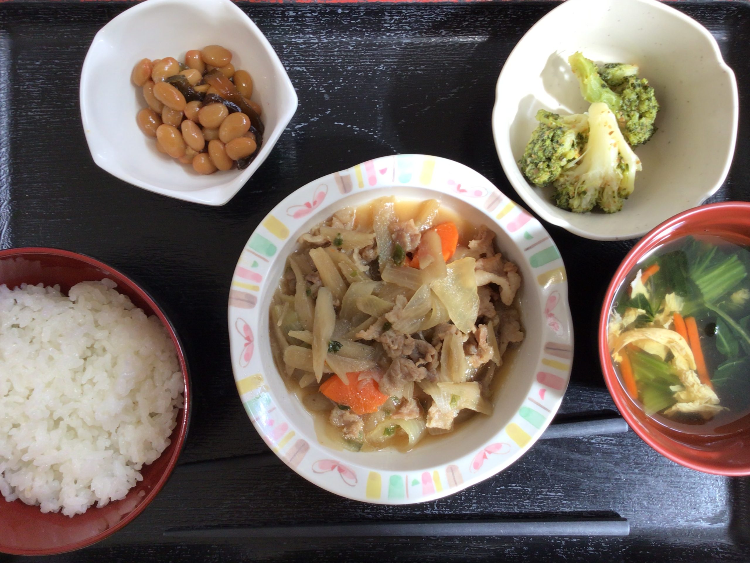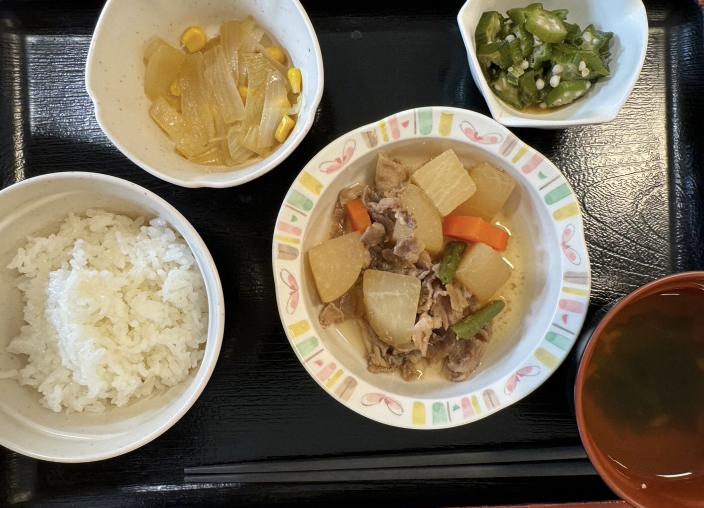 【昼食】 1.ご飯 2.豚と大根の煮物 3.玉葱炒め 4.オクラのポン酢和え 5.すまし汁
