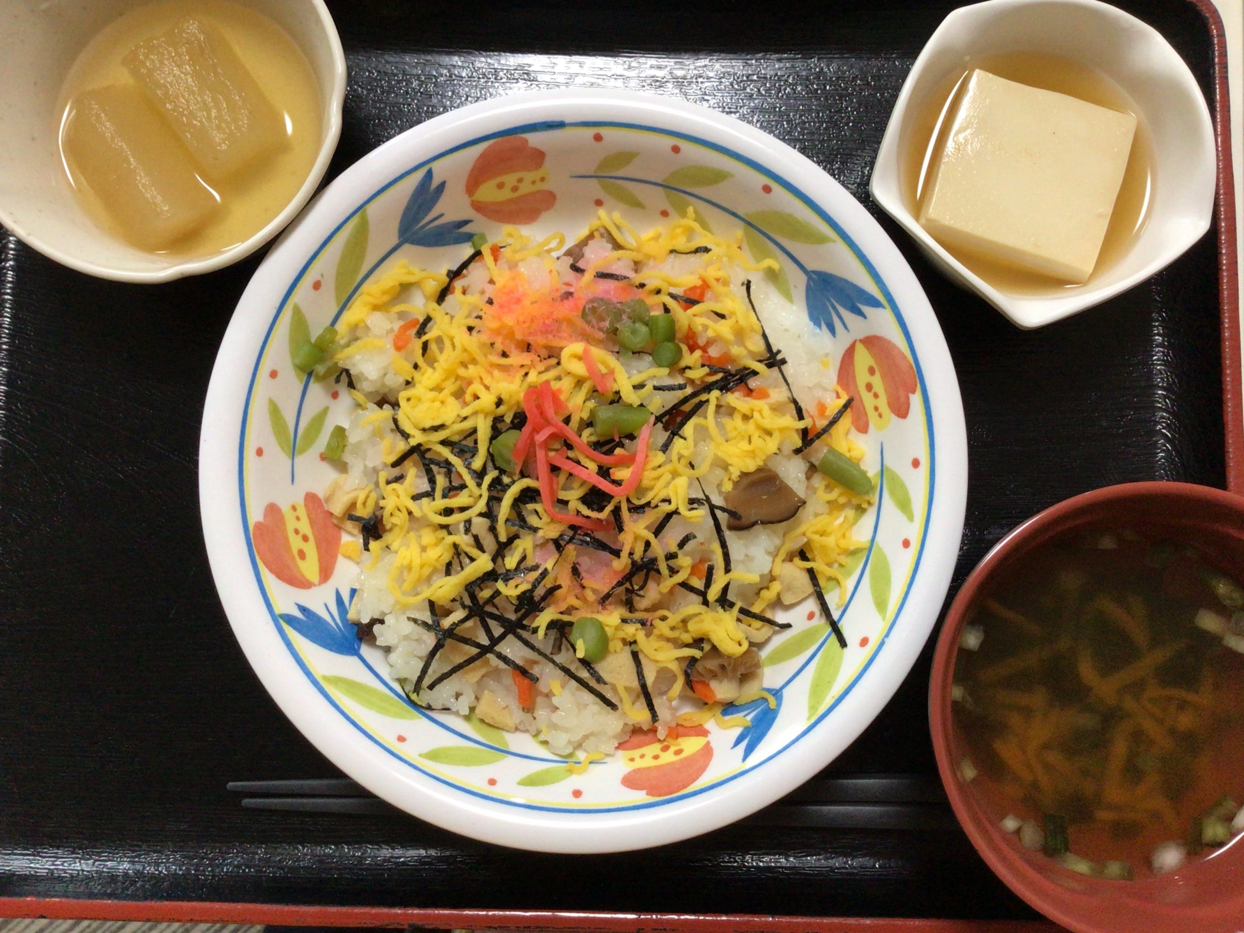 【昼食】 1.五目チラシ寿司 2.冬瓜の煮物 3.煮奴 4.すまし汁