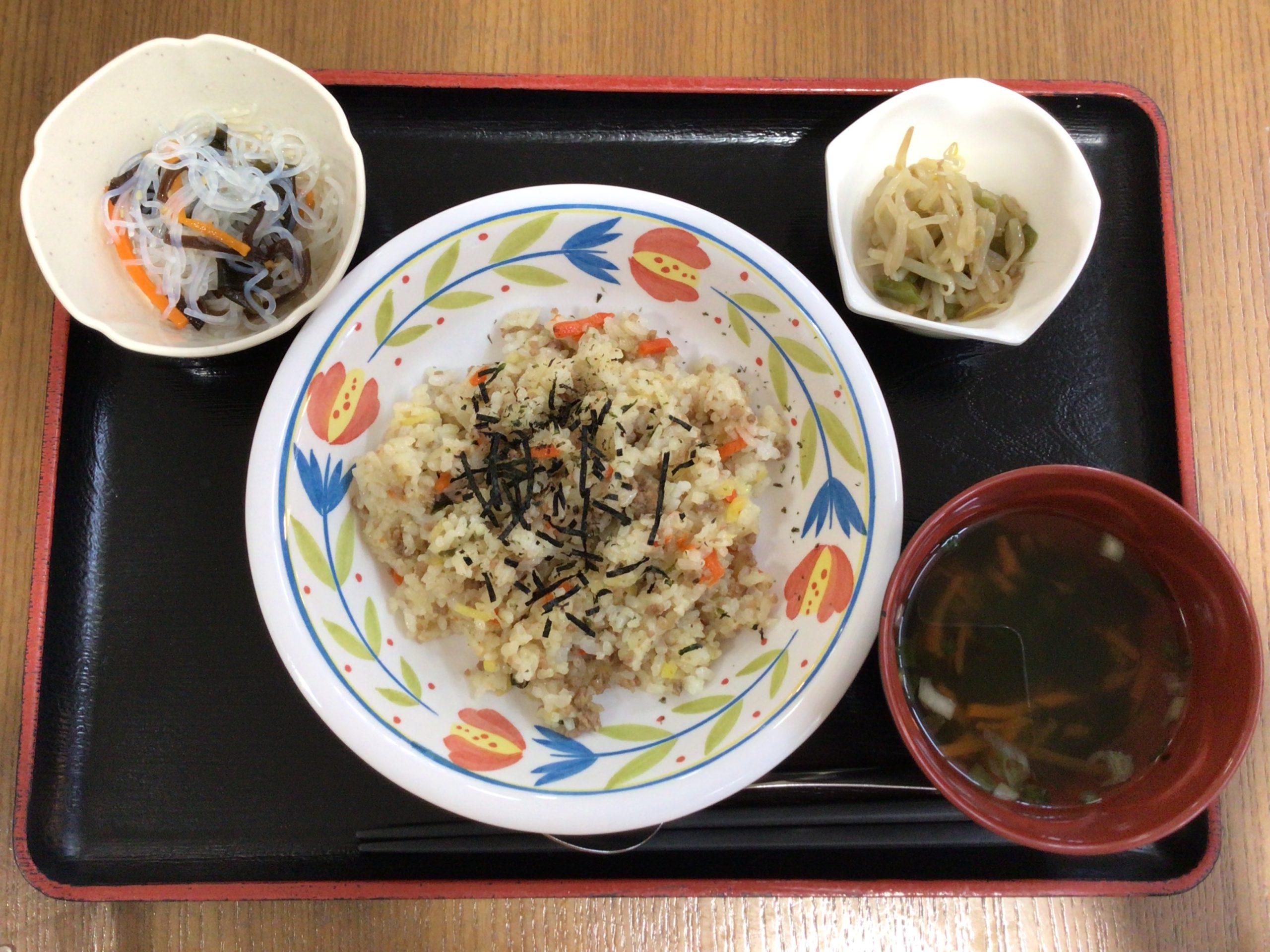 【昼食】 1.キンパ風まぜご飯 2.中華春雨サラダ 3.もやしの炒め物 4.すまし汁