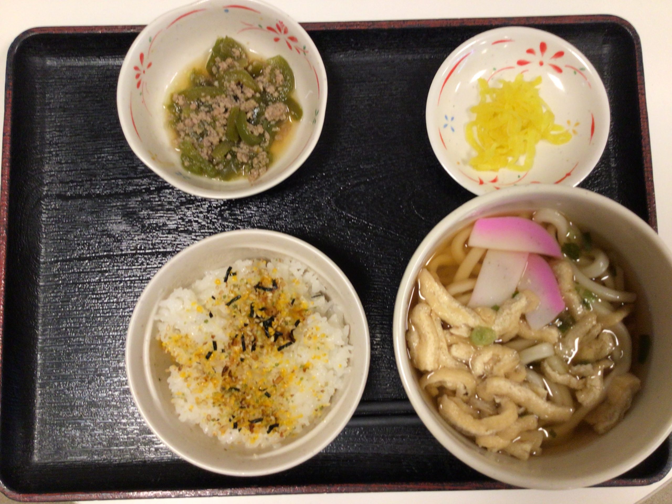 【昼食】 1.ふりかけご飯(小) 2.きつねうどん 3.ピーマンのそぼろ炒め 4.漬物